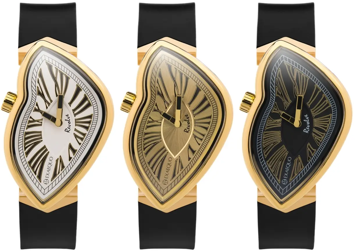 Kluczową cechą jest asymetria i płynność linii, które kontrastują z geometryczną precyzją, typową dla tradycyjnych zegarków. Koperty zegarków Exaequo mają owalny, spłaszczony kształt, który zdaje się „rozpływać” na nadgarstku, co jest bezpośrednim odniesieniem do surrealistycznej estetyki. Wykorzystanie wysokiej jakości materiałów, takich jak stal nierdzewna 316L, srebro 925 czy powlekanie PVD w odcieniach złota, nadaje zegarkom elegancji i trwałości.
