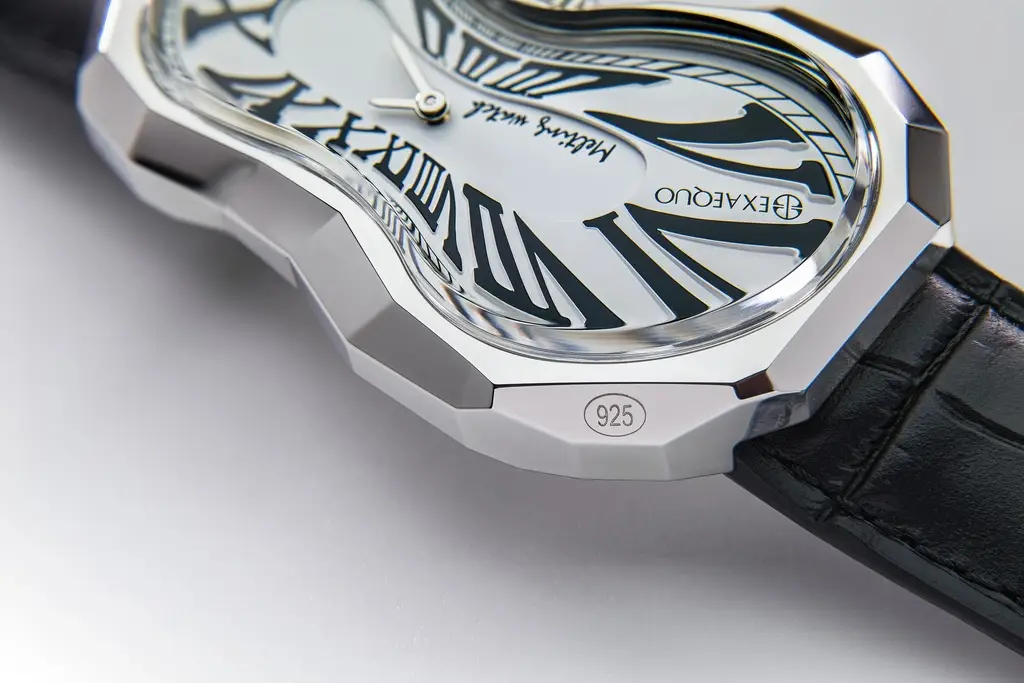 Polyedron Melting Watch Silver 925 to najbardziej ekskluzywny model w ofercie marki Exaequo, wykonany ze srebra próby 925. Koperta, o wymiarach 47 mm x 28 mm zachowuje charakterystyczny, płynny kształt Melting Watch, ale materiał, z którego ją wykonano - czyste srebro - nadaje jej wyjątkowego blasku i prestiżu. Asymetryczne linie i spłaszczona forma koperty tworzą efekt „rozpływania się” na nadgarstku, co jest znakiem rozpoznawczym marki.