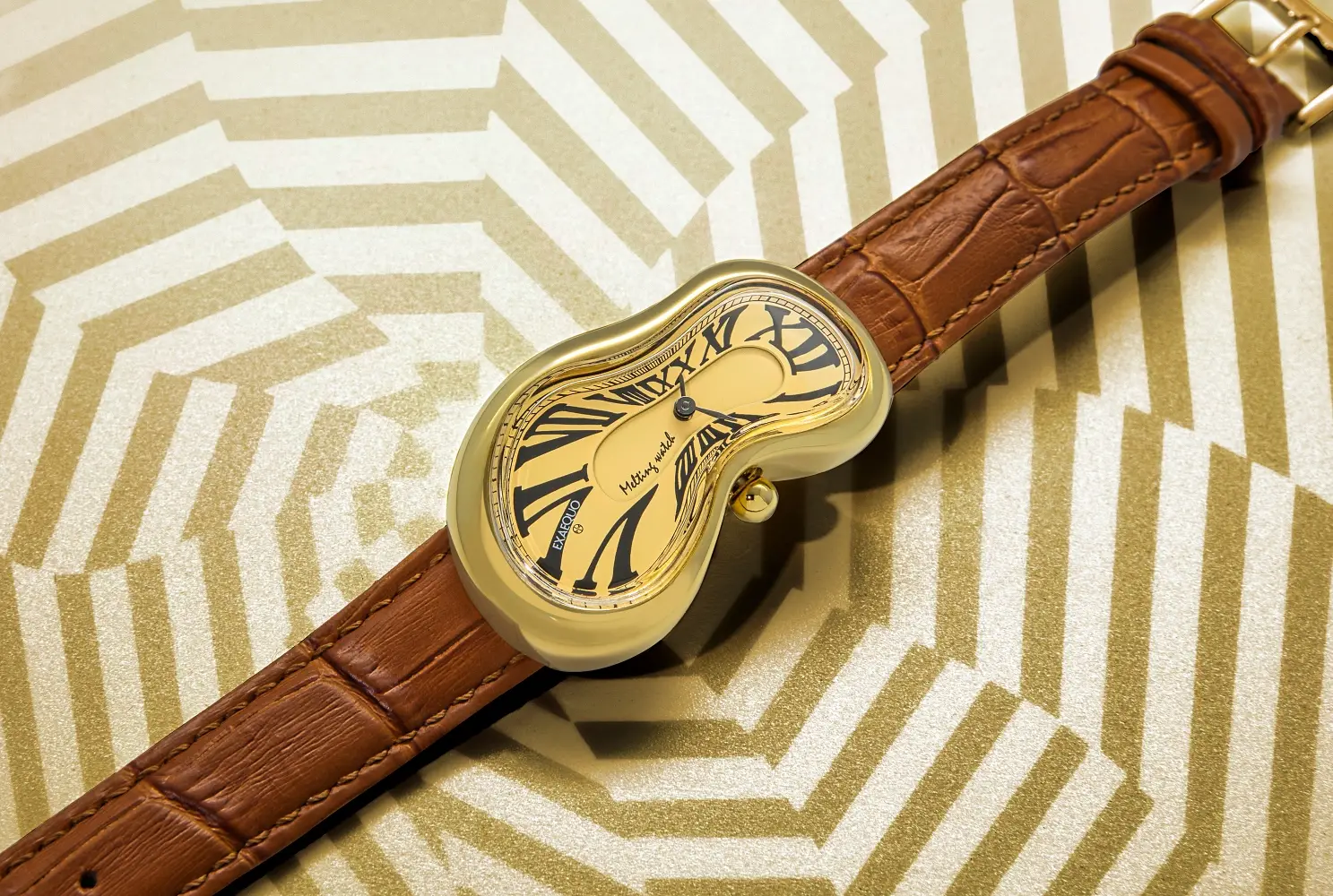 Tarcza w złotym kolorze, chroniona jest przez wypukłe szkło z tworzywa sztucznego. Na cyferblacie znajdziemy rzymskie cyfry i kontrastujące indeksy, które harmonizują z liniami koperty. Mechanizm zegarka to szwajcarska kwarcowa Ronda 751-1. Pasek wykonany jest z wysokiej jakości skóry, dostępny z klamrą w stylu „melted”, ozdobioną logo marki, która dopełnia surrealistyczną estetykę. Zegarek jest wodoszczelny do 30 metrów (3 ATM).