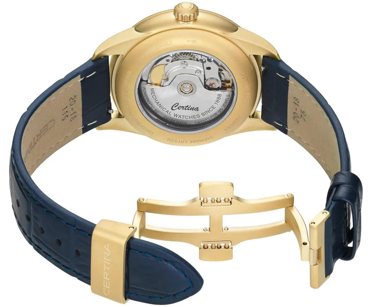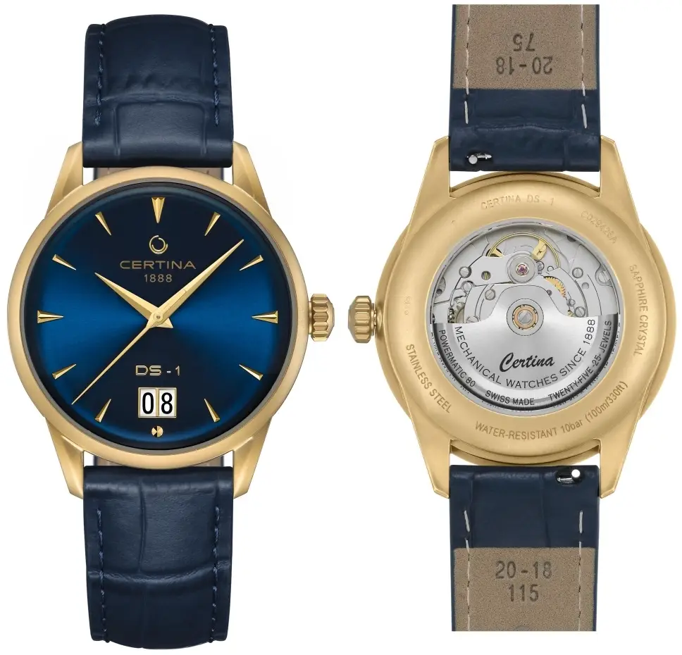 Srebrzyste wskazówki i indeksy w wariancie czarnym, oraz złociste w granatowo-złocistym zapewniają dobrą czytelność głównego wskazania, a komplikacja Big Date, umieszczona na godzinie 6., pozwala na łatwy odczyt daty. Dodatkowo system Certina DS (Double Security) gwarantuje trwałość i wytrzymałość, zabezpieczając mechanizm Eta Powermatic 80.651. To nowoczesne zegarkowe serce zapewniające wysoki poziom precyzji pracy, bezawaryjność, odporność na działanie pół magnetycznych, czy też wahania temperatury, dzięki sprężynie włosowej Nivachron. A także bardzo wysoki poziom rezerwy chodu, wynoszący aż 80 godzin. Te cechy czynią z modelu Certina DS-1 Big Date zegarek dla osób, które cenią pewność.