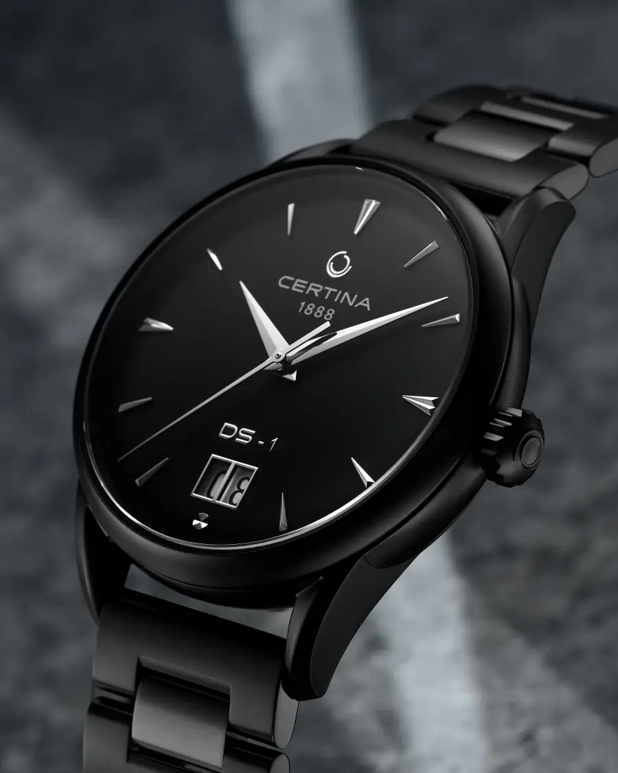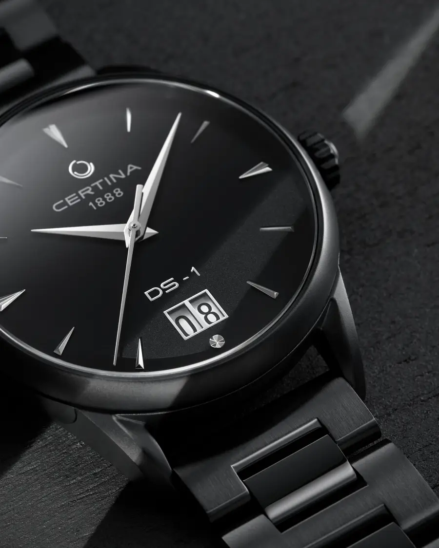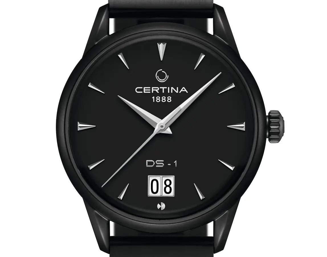 Koperta Certina DS-1 Big Date ma bardzo klasyczny kształt, z łagodnie wyprowadzonymi uchami o dwupłaszczyznowej górnej powierzchni. Model w wersji czarnej jest matowy, dzięki pokryciu jego koperty wspomnianą już powłoką w kolorze czarnym. Wytworzona tak antyrefleksyjna powierzchnia podkreśla nowoczesny, miejski charakter zegarka.