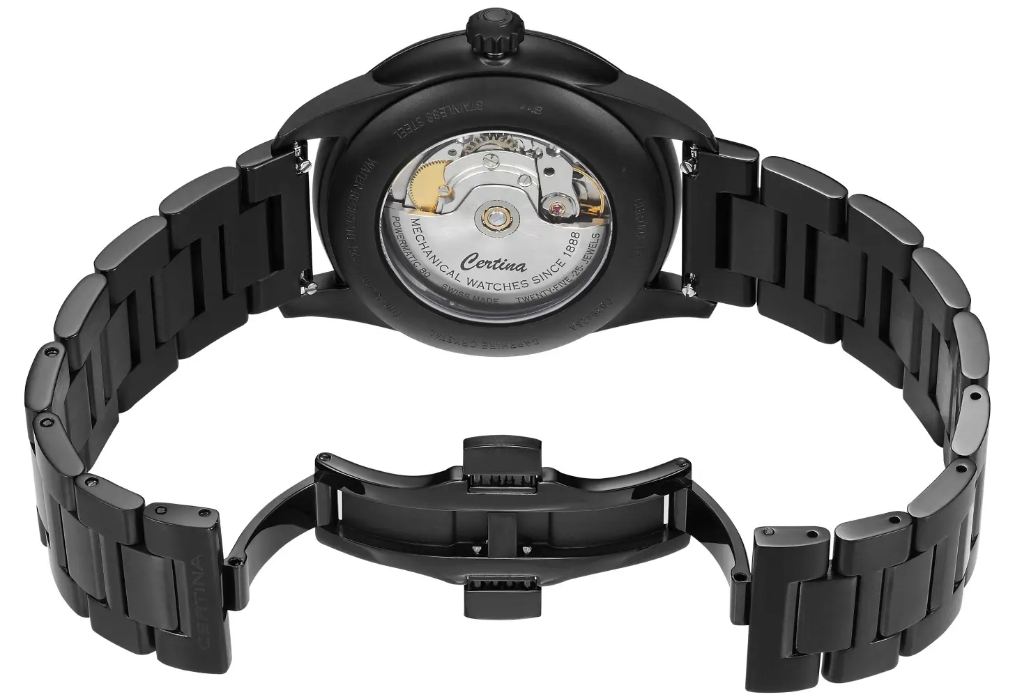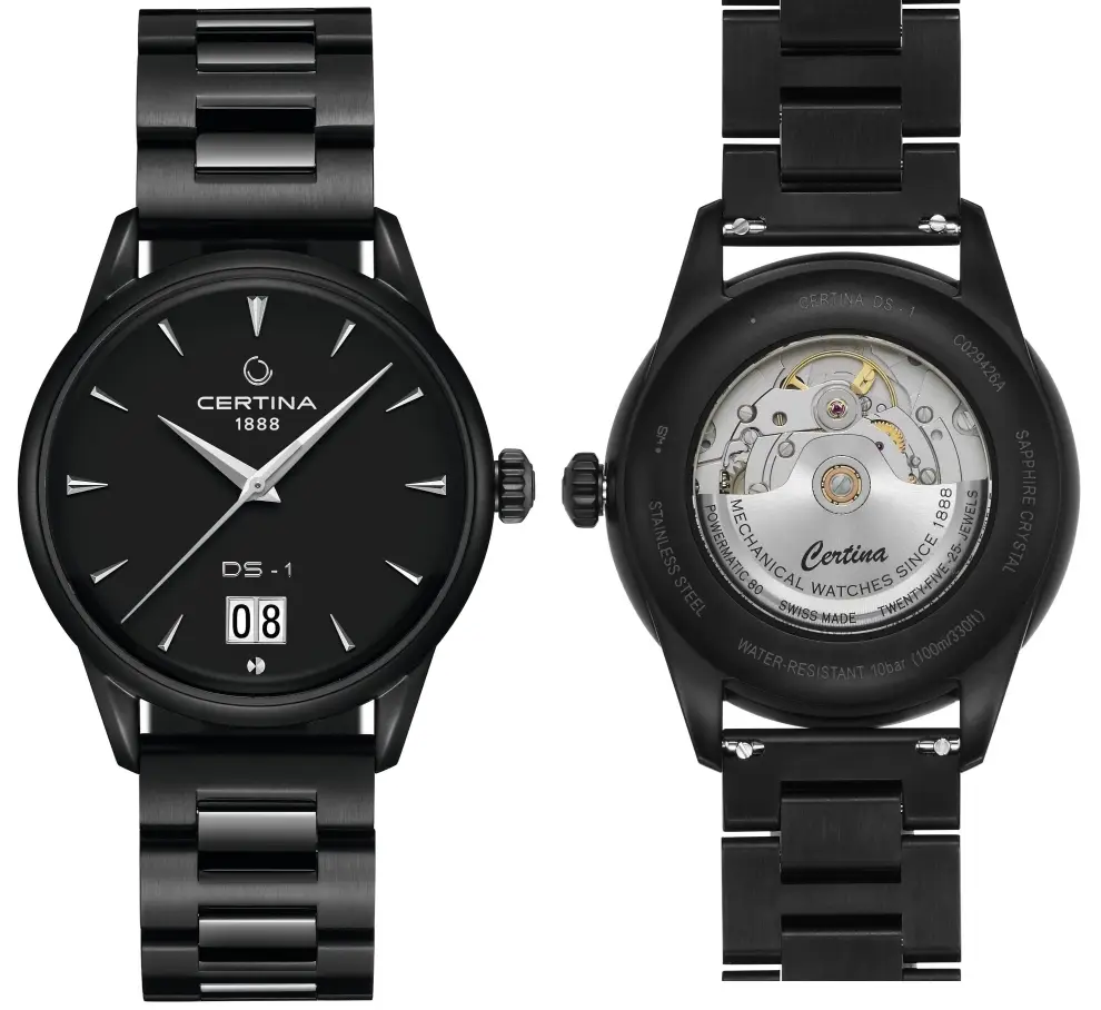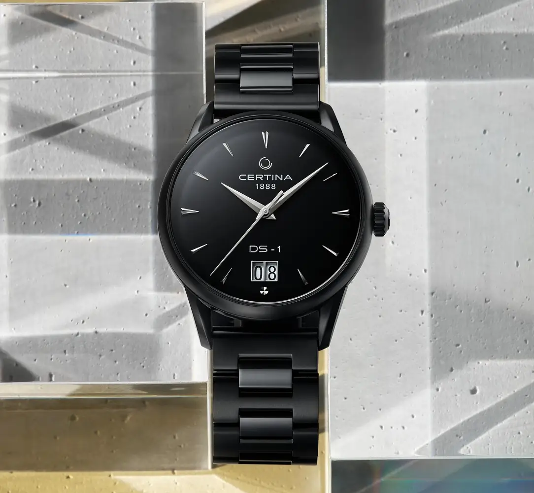 Koperta Certina DS-1 Big Date ma bardzo klasyczny kształt, z łagodnie wyprowadzonymi uchami o dwupłaszczyznowej górnej powierzchni. Model w wersji czarnej jest matowy, dzięki pokryciu jego koperty wspomnianą już powłoką w kolorze czarnym. Wytworzona tak antyrefleksyjna powierzchnia podkreśla nowoczesny, miejski charakter zegarka.