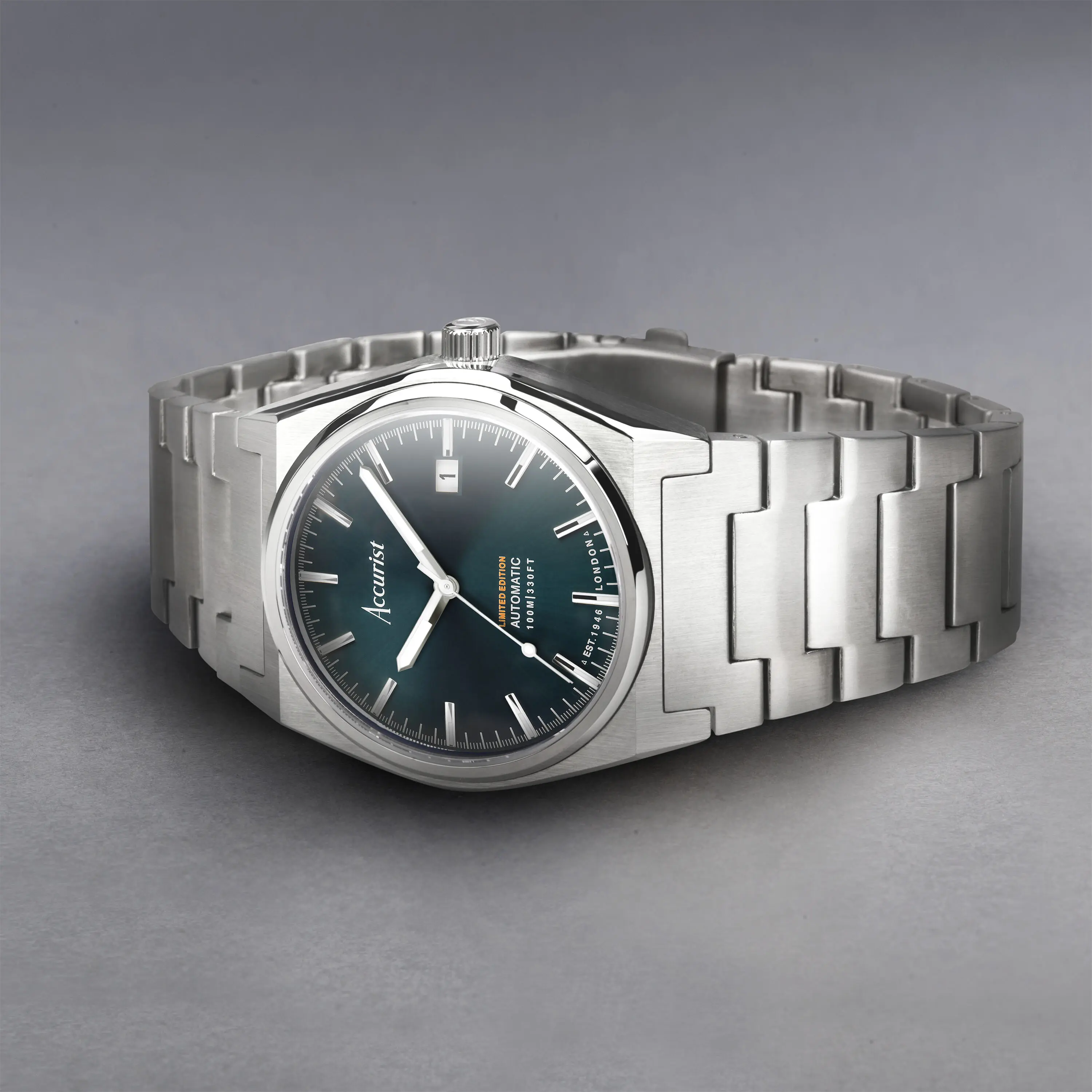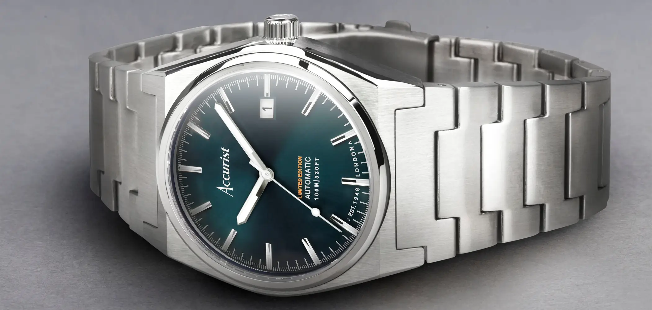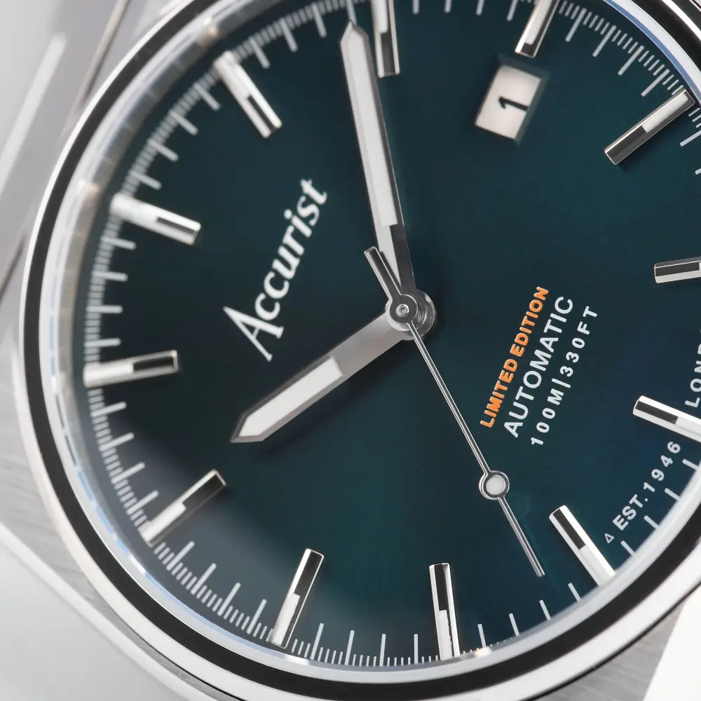 Niebesko-zielona tarcza z delikatnymi indeksami i wskazówkami w srebrnym odcieniu oferuje wyrafinowany wygląd, uzupełniony datownikiem. Solidna, stalowa bransoleta ma system szybkiej zmiany, a przeszklony dekiel eksponuje mechanizm Seiko NH35 z automatycznym naciągiem. Brzeg dekla zdobiony jest „panoramą Accurist”.
