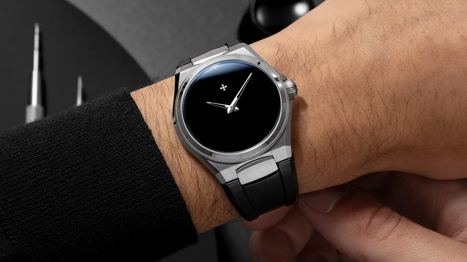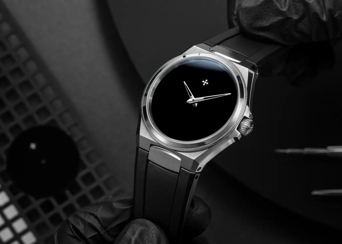 Redentore Ultrablack (ref. 1221510C) to minimalistyczny projekt, inspirowany neoklasycystyczną architekturą Bazyliki Redentore w Wenecji. Koperta o średnicy 40 mm, wykonana ze stali nierdzewnej 316L, ma grubość 11 mm i długość od ucha do ucha 46,7 mm, z polerowanym wykończeniem powierzchni. Tarcza w absolutnej czerni, lakierowana japońską farbą Musou Black™ pochłaniającą 99,4% światła, jest niemal pozbawiona detali poza wskazówkami i logo, co tworzy hipnotyzujący efekt optyczny.