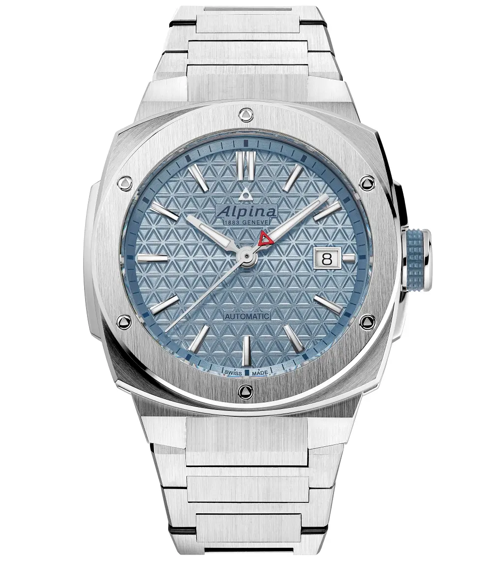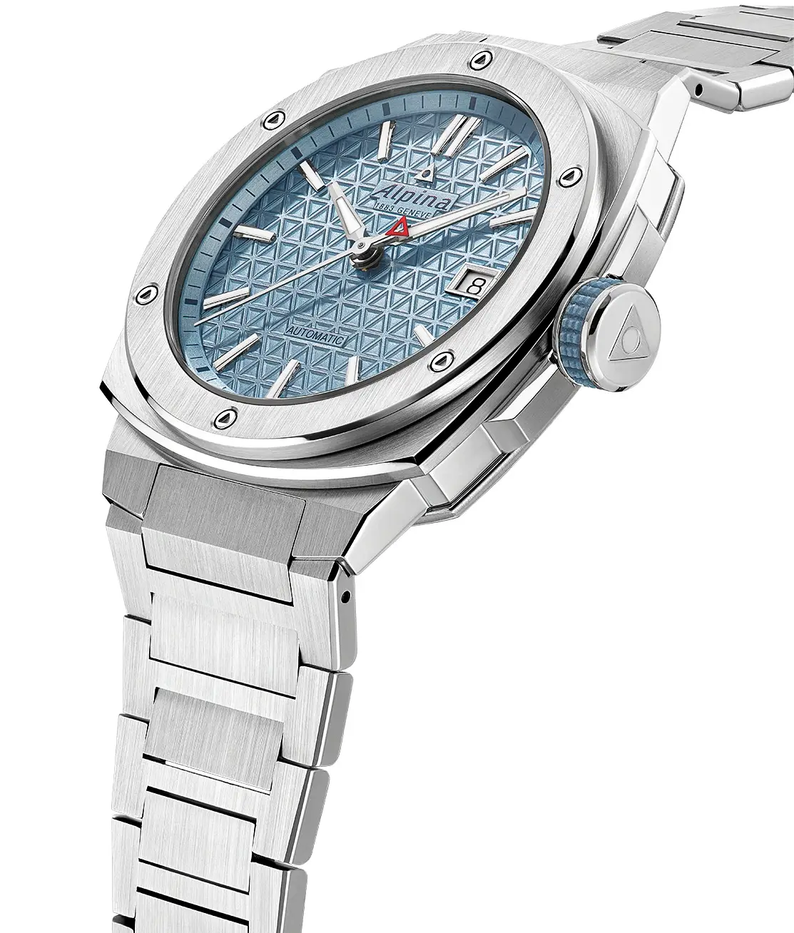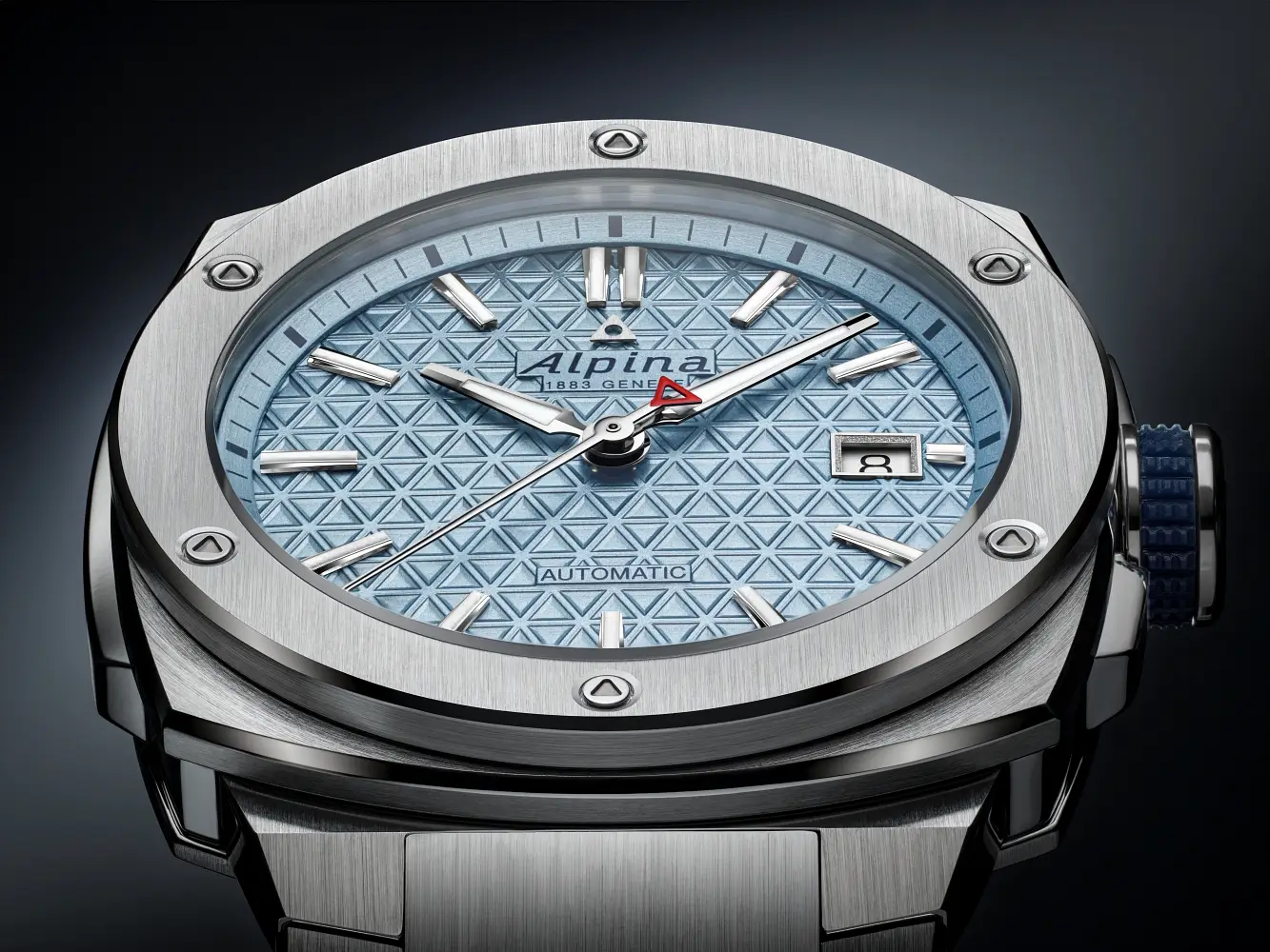W przypadku Alpiner Extreme Automatic Ice Blue tarcza zyskała dodatkową głębię, dzięki strukturalnemu wzorowi przypominającemu trójkąt, który symbolicznie nawiązuje do alpejskiego szczytu i nadaje powierzchni tarczy dynamicznego charakteru.