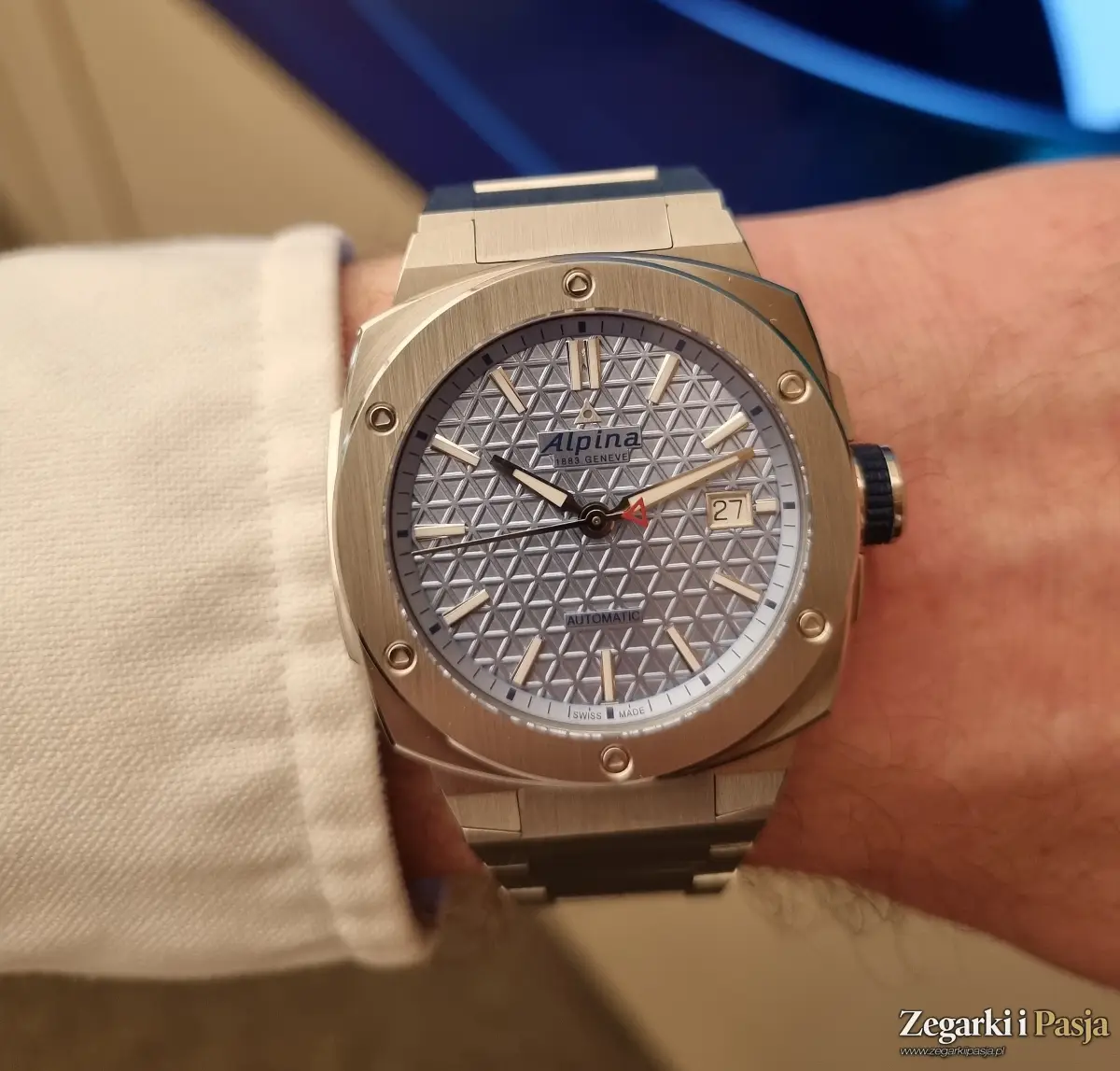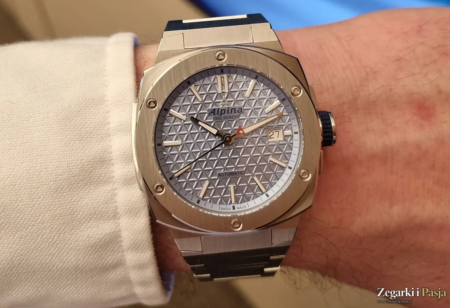 Krawędzie koperty i bransolety są wypolerowane na wysoki połysk, co podkreśla linie załamania. A motylkowe zapięcie z wygrawerowanym logo Alpiny dopełnia wizerunku.
