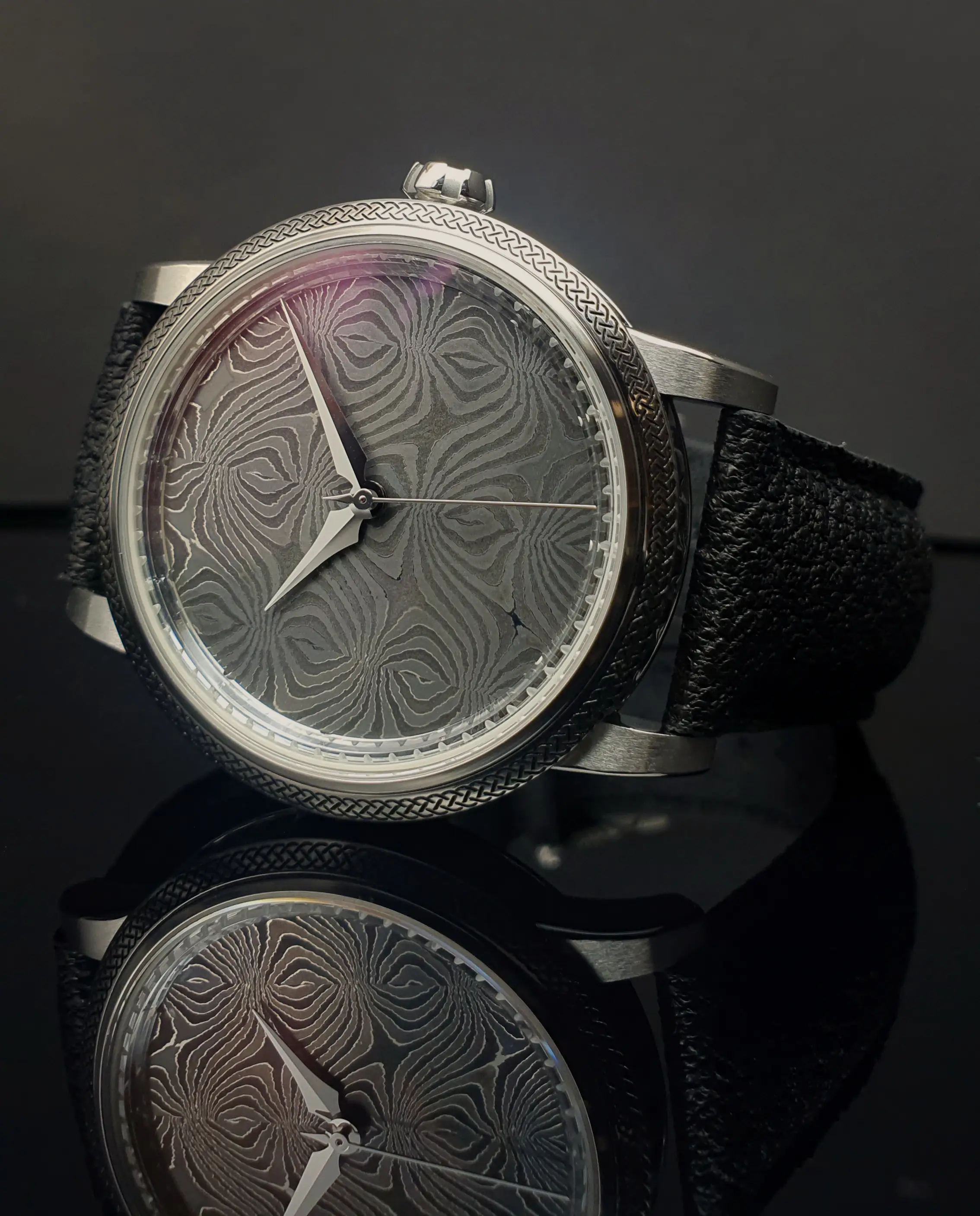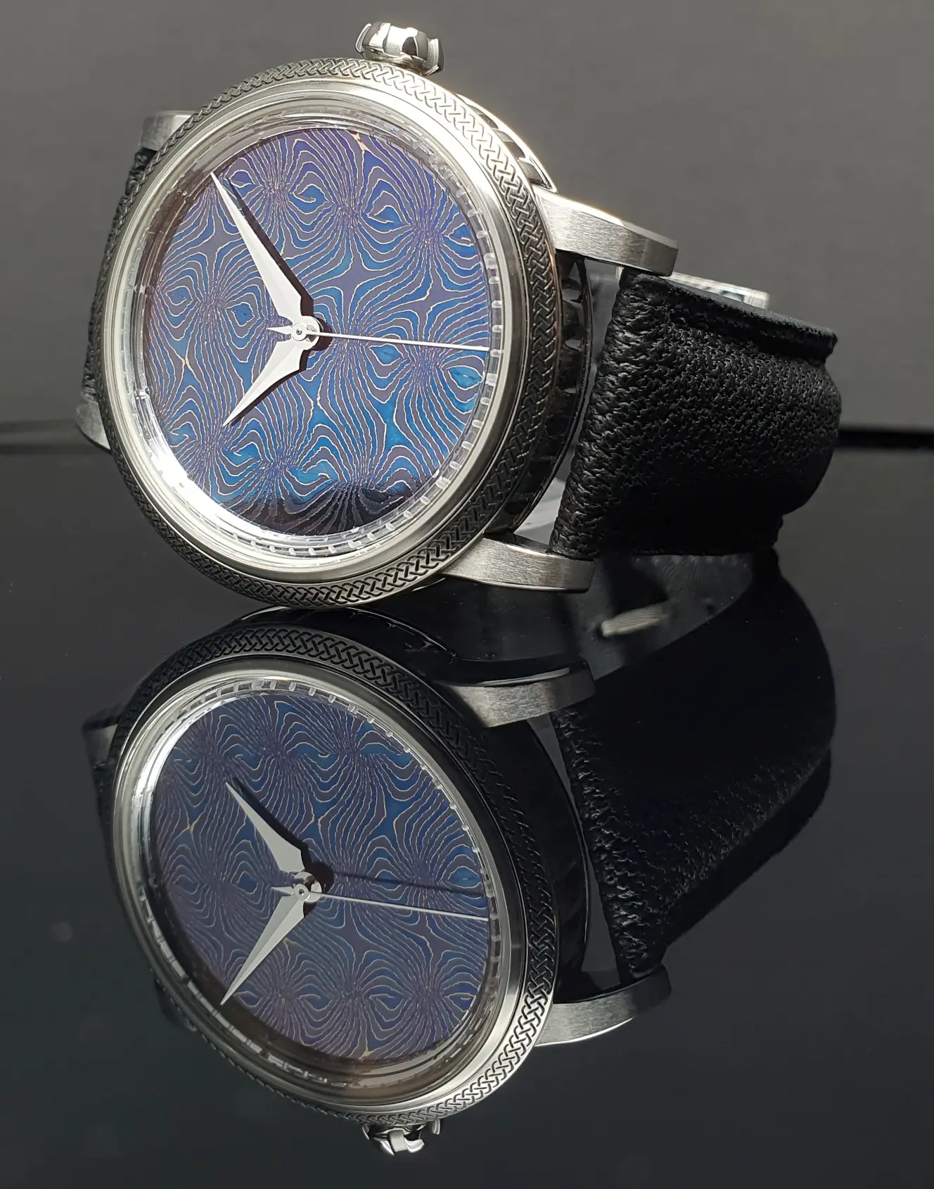 Cztery skręcone pręty stali warstwowej zostały precyzyjnie ułożone i zgrzane w jedną całość, jak w rdzeniu oryginalnego miecza. Conny Persson i Patrik Sjögren zdecydowali się zwiększyć liczbę warstw do 15–20, aby uzyskać proporcje wzoru lepiej pasujące do skali zegarkowej tarczy. Cyferblat został ręcznie wykuty przez Conny’ego Perssona, który z niezwykłą precyzją odtworzył proces historycznego wytwarzania rdzenia miecza metodą damasceńską.