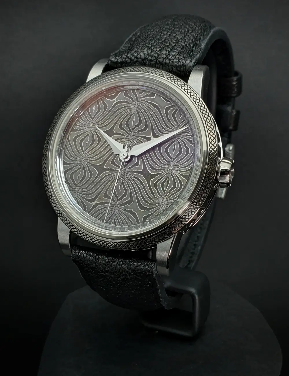 Luneta i dekiel zegarka zdobione są wzorem czteroliniowej plecionki wikingów – inspirowanym zdobieniami runicznymi oraz ornamentami z łodzi wikińskich. Tego typu motywy występowały na kamieniach runicznych, biżuterii oraz elementach zdobniczych, często symbolizując jedność, siłę lub wieczność.