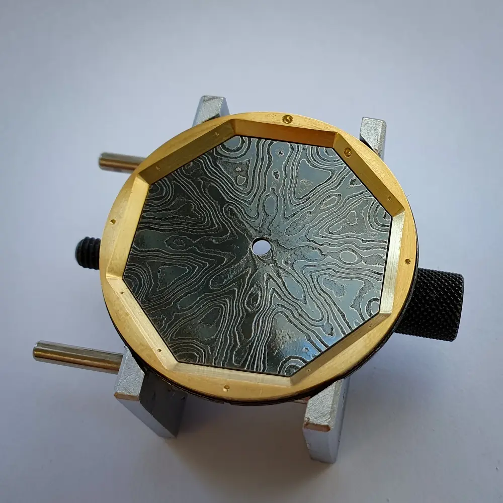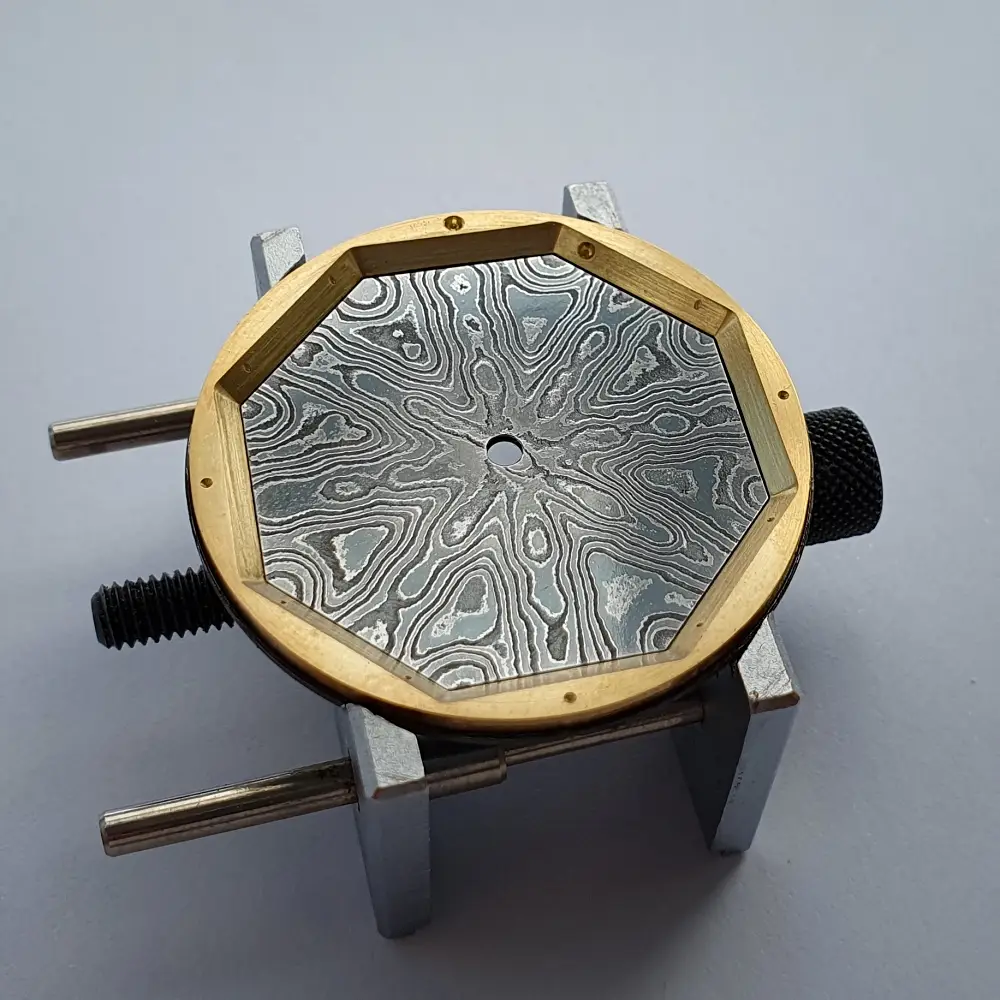 Tarcza zegarka Fullerö została wykonana w ten sam sposób, lecz z użyciem nowoczesnych stali narzędziowych, a dodatkowo – z cienką warstwą niklu między warstwami.