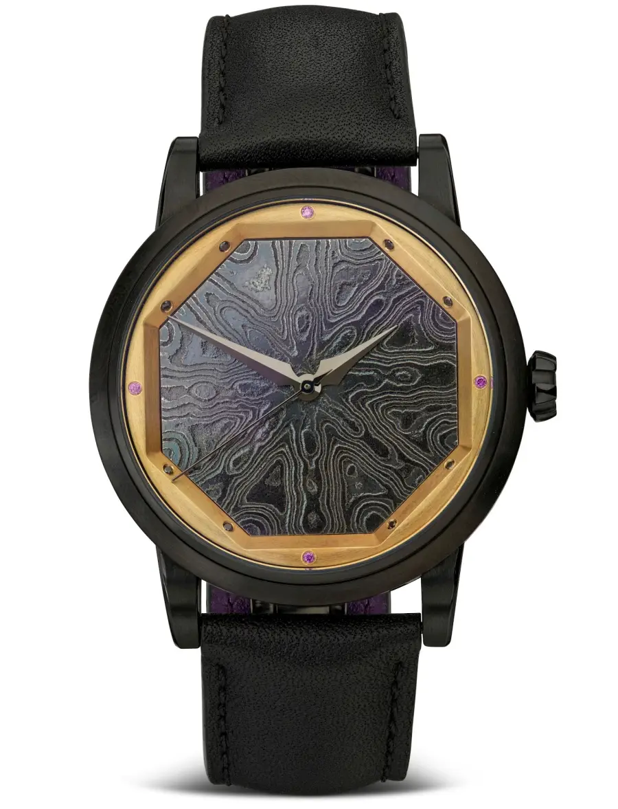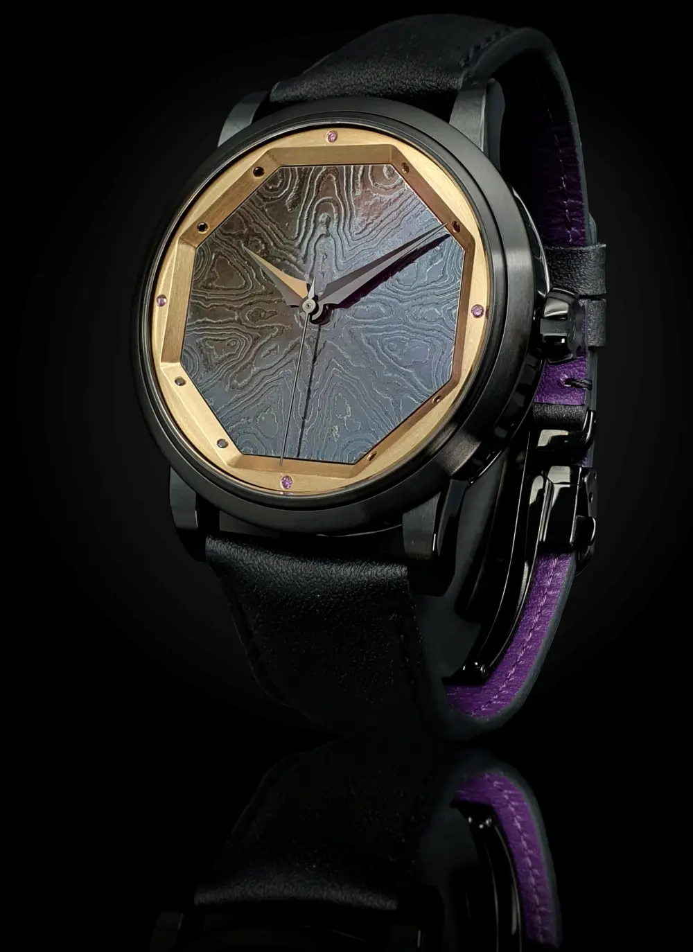 Ośmiokąt – znak rozpoznawczy projektów Martina Keya – odgrywa tu kluczową rolę: „Mój znak firmowy, ośmiokąt, towarzyszy mi od początku – to mocny symbol silnego zaangażowania”. Znalazło to odzwierciedlenie w pierścieniu indeksowym z litego złota (18k), o głębokim, sfazowanym ośmiokątnym profilu. Znaczniki godzin to duże diamenty w kolorze purpurowym i czarnym – nawiązujące do palety barw marki Martina Keya: złota, purpury i czerni.