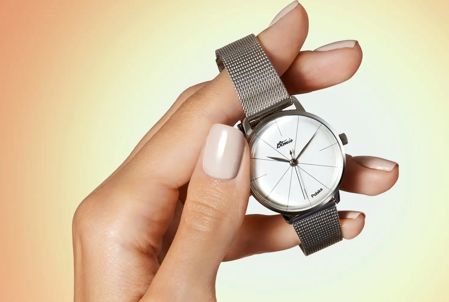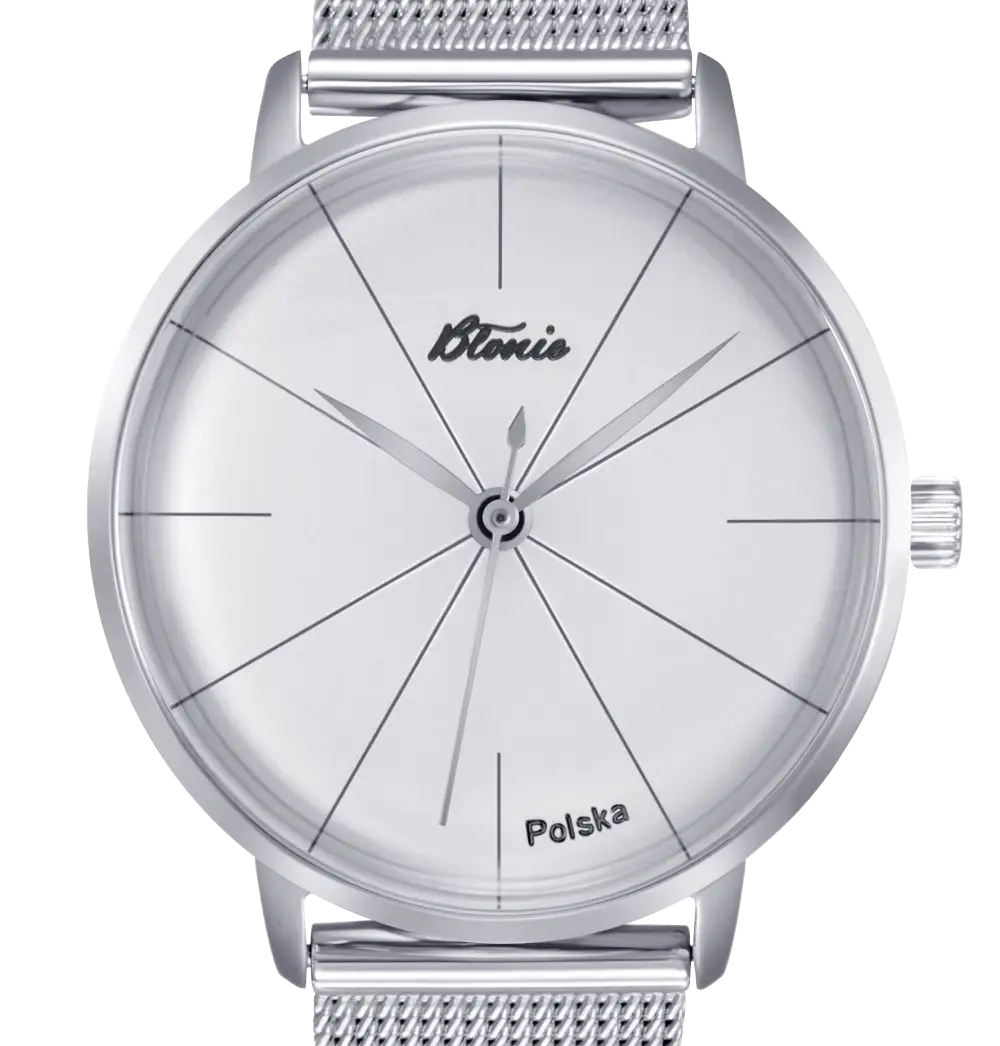 Tarcza tych zegarków jest bardzo charakterystyczna, co wiąże się z krzyżującymi się na niej wąskimi liniami, które tworzą jednocześnie osiem indeksów godzinowych. Cztery podstawowe to także wąskie kreski. Pod godziną 12. widzimy lśniące, nakładane logo marki, a pomiędzy godzinami 5. i 6. napis Polska. Do tego dobrano klasyczne, eleganckie wskazówki godzinową i minutową, zaprojektowane w stylu wydłużonych liści, oraz prosty, delikatny sekundnik.