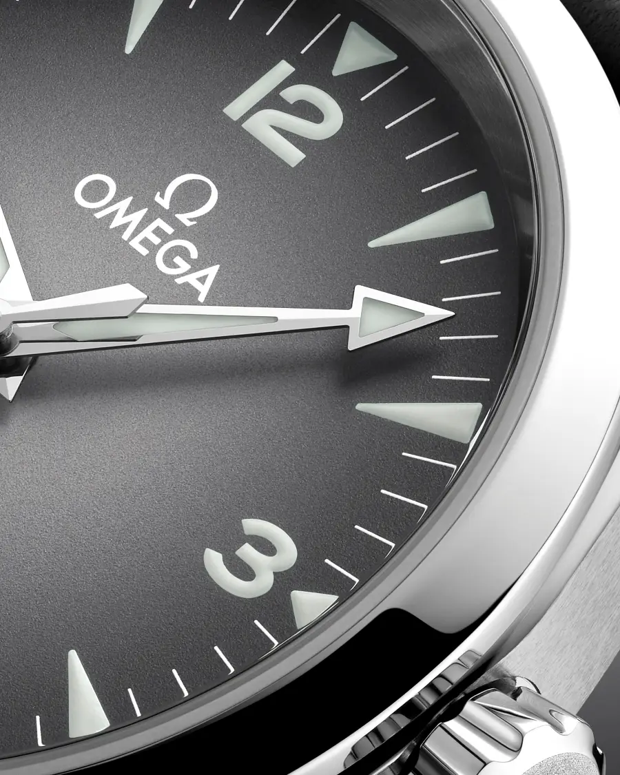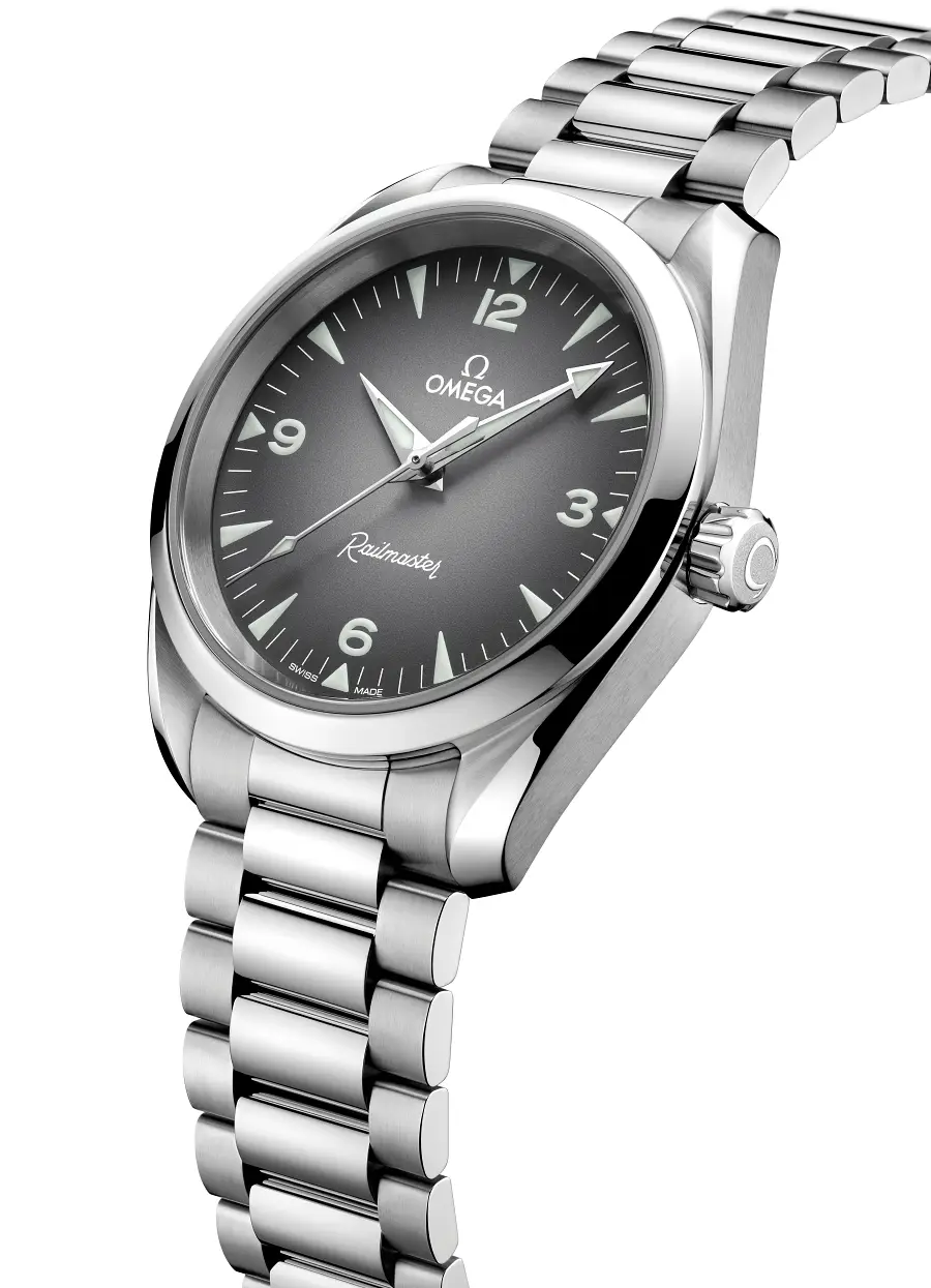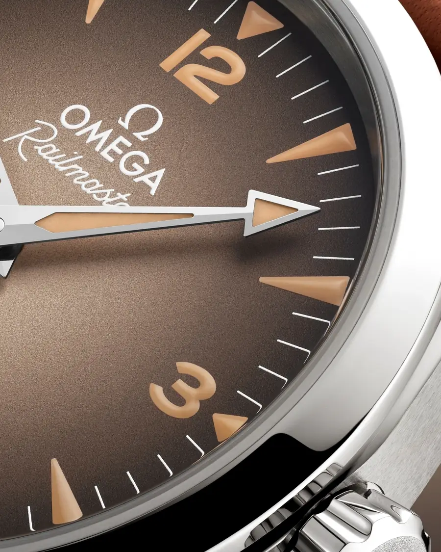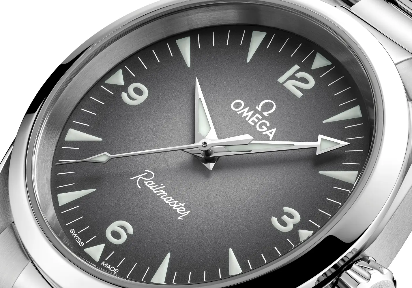 Aby zachować minimalistyczny charakter oryginału, na tarczy nie ma żadnych dodatkowych opisów, poza logotypem Omegi oraz nazwą Railmaster. Duże indeksy o znanym kształcie i cyfry są nadrukowane substancją Super-LumiNova, która zapewnia doskonałą czytelność wskazań w dobry świetle i oczywiście, po naświetleniu, także w ciemności. O każdej porze dnia i nocy.