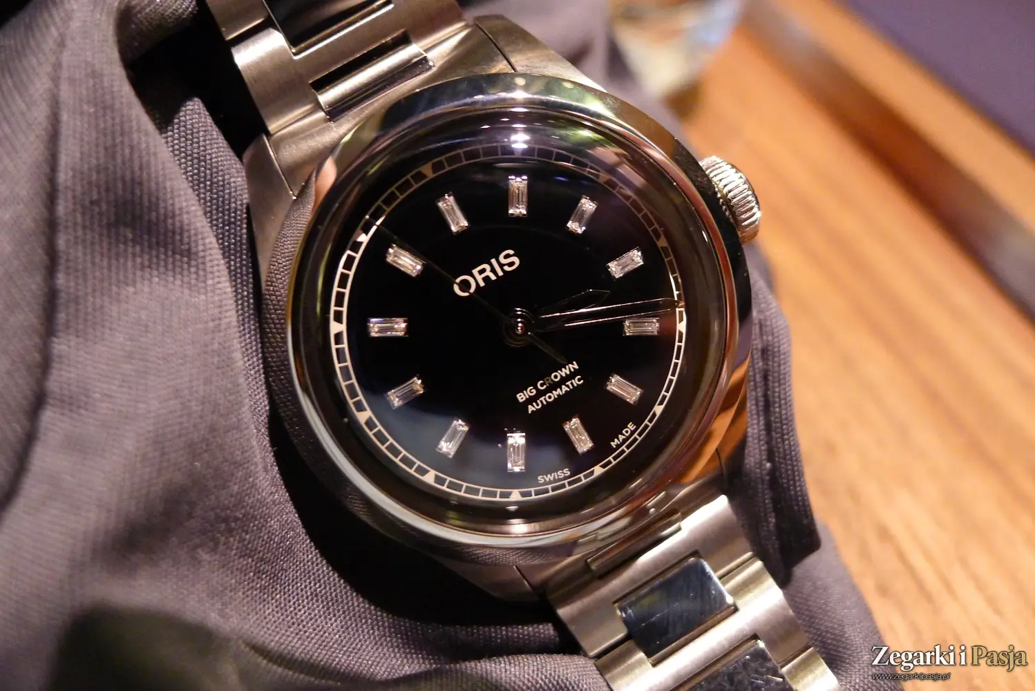 Następną nowością 2025 jest model Oris Big Crown z kopertą o średnicy 34 mm. To zegarki w dwóch wersjach - pierwszy ma teksturowaną, beżową tarczę, a drugi tarczę czarną, z 12 laboratoryjnie uzyskanymi diamentami bagietkowymi, będącymi jednocześnie indeksami godzinowymi. Skala sekundowa jest podobna do tej w większych wersjach.