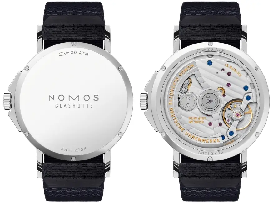 Mechanizm Nomos kaliber DUW 6101 ma 42 kamienie łożyskujące wykonane z syntetycznego rubinu, które redukują tarcie i zwiększają trwałość mechanizmu. Powierzchnie komponentów mechanizmu są rodowane i zdobione charakterystycznymi dla Glashütte pasami genewskimi oraz perłowaniem Nomos, co nadaje mu elegancki wygląd. Mostek trzy-czwarte, typowy dla zegarków z Glashütte, zapewnia stabilność konstrukcji, a niebieskie, hartowane śruby i złote grawerunki dodają mechanizmowi estetycznego wyrafinowania. Również szkieletowany wahnik ozdobiony jest pasami genewskimi i złotym, grawerowanym napisem.
