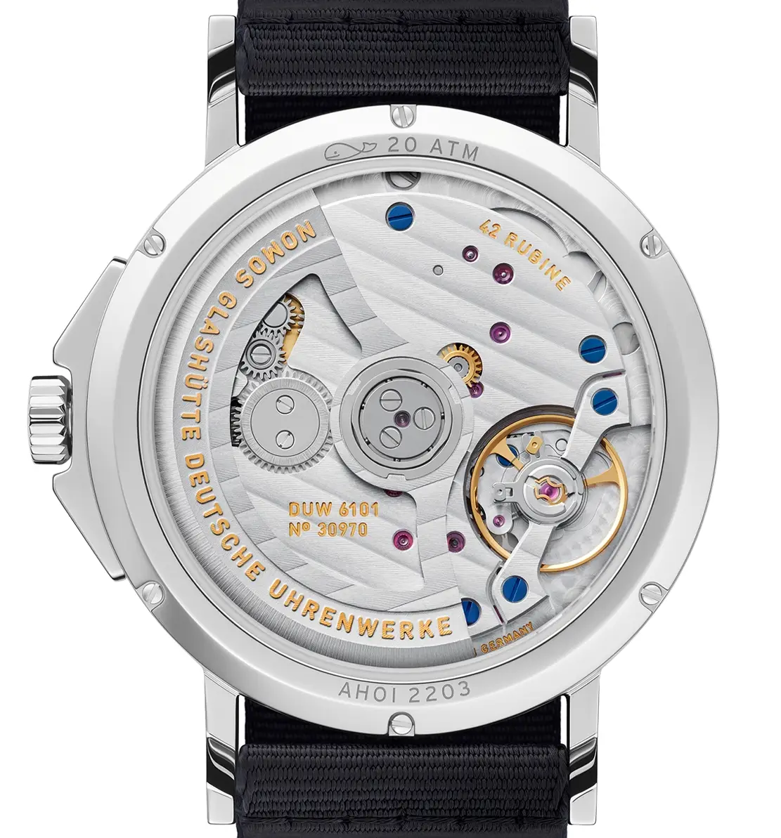 DUW 6101 to mechanizm z naciągiem automatycznym, dwukierunkowym, co oznacza, że wahnik napina sprężynę główną zarówno podczas ruchu w prawo, jak i w lewo. Rotor jest pozłacany i ozdobiony grawerem, co można podziwiać w wersji z przeszklonym deklem. Mechanizm ma średnicę 33 mm (14,5 linii paryskiej) i wysokość zaledwie 3,6 mm, dzięki czemu możliwe było zachowanie smukłego profilu zegarka. Rezerwa chodu wynosi 42 godziny, co jest standardem w tej klasie zegarków i zapewnia nieprzerwane działanie przez niemal dwie doby, bez konieczności noszenia lub nakręcania.