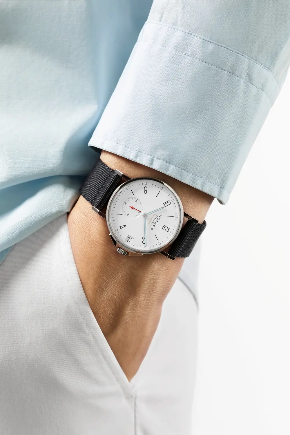 Wersja z białym cyferblatem doskonale uzupełnia gamę Ahoi, wprowadzając do niej najjaśniejszy odcień w bardzo uniwersalnym rozmiarze. Mogę zaliczyć siebie do fanów marki z Glashütte i moim absolutnym faworytem jest Tangente 2 Date, który miałem okazję testować, ale z racji niskiej wodoszczelności nie bardzo pasujący do mojego stylu życia. Kiedy patrzę na Ahoi z białą tarczą i błękitnymi wskazówkami, wiem, że mógłby to być mój jedyny zegarek, gdybym musiał wybrać jeden.