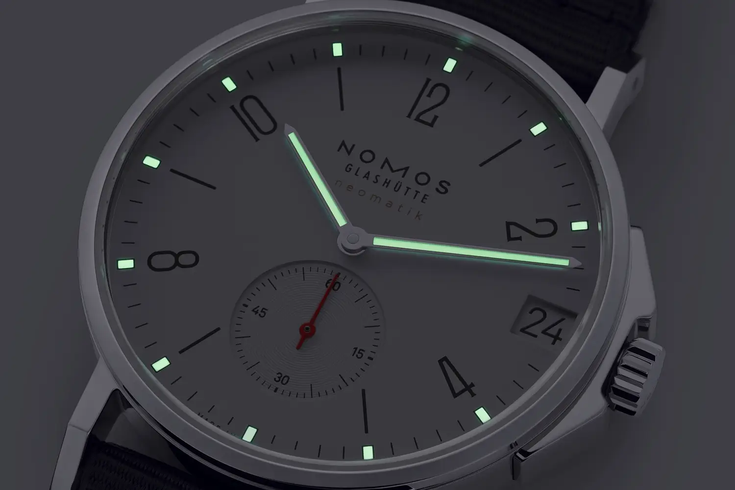 Tarcza zegarka ma kolor biały z galwanizowanym wykończeniem, co nadaje jej subtelny, srebrzysty połysk, kiedy patrzymy na nią pod odpowiednim kątem, a jednocześnie nie powoduje powstawania refleksów światła. Minimalistyczny styl tarczy jest zgodny z filozofią Nomos – prostota i czytelność są tu na pierwszym miejscu.