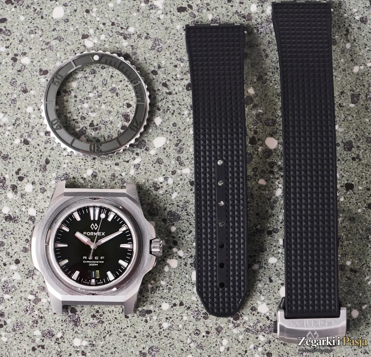 Model Formex Reef 42 mm wyróżnia się także innowacyjnym systemem szybkiej wymiany paska i bransolety, który nie wymaga użycia żadnych narzędzi.