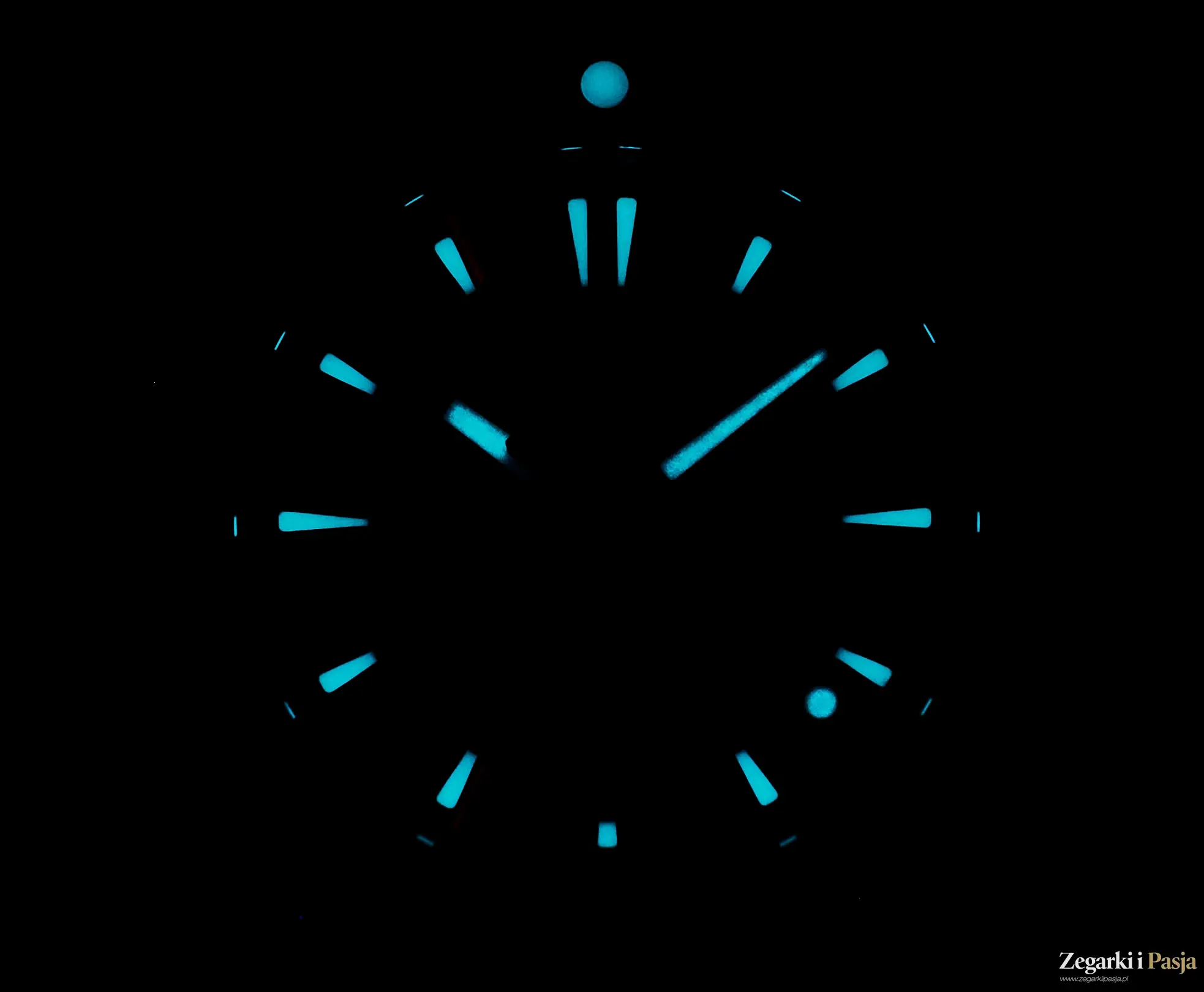 Zarówno indeksy, jak i wskazówki, a także kropka na znaczniku zera na pierścieniu, są wypełnione substancją luminescencyjną Super-LumiNova® BGW9, która emituje długotrwały niebieski blask w ciemności – rzecz kluczowa dla czytelności w nocy lub podczas nurkowania.