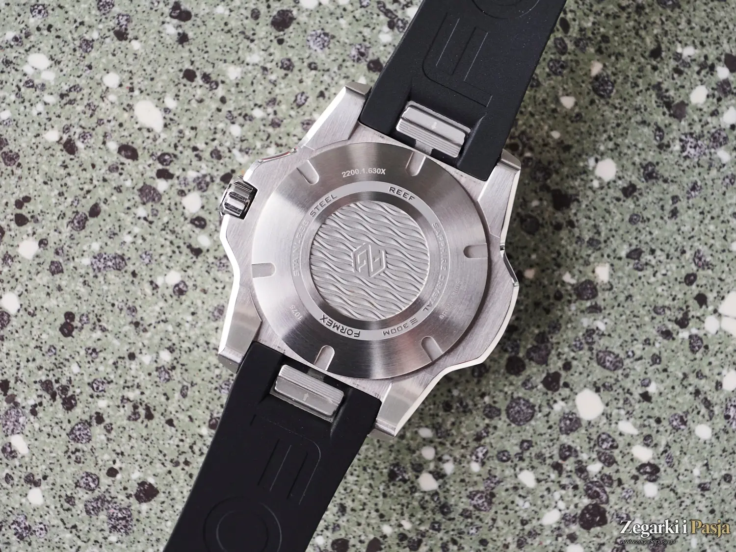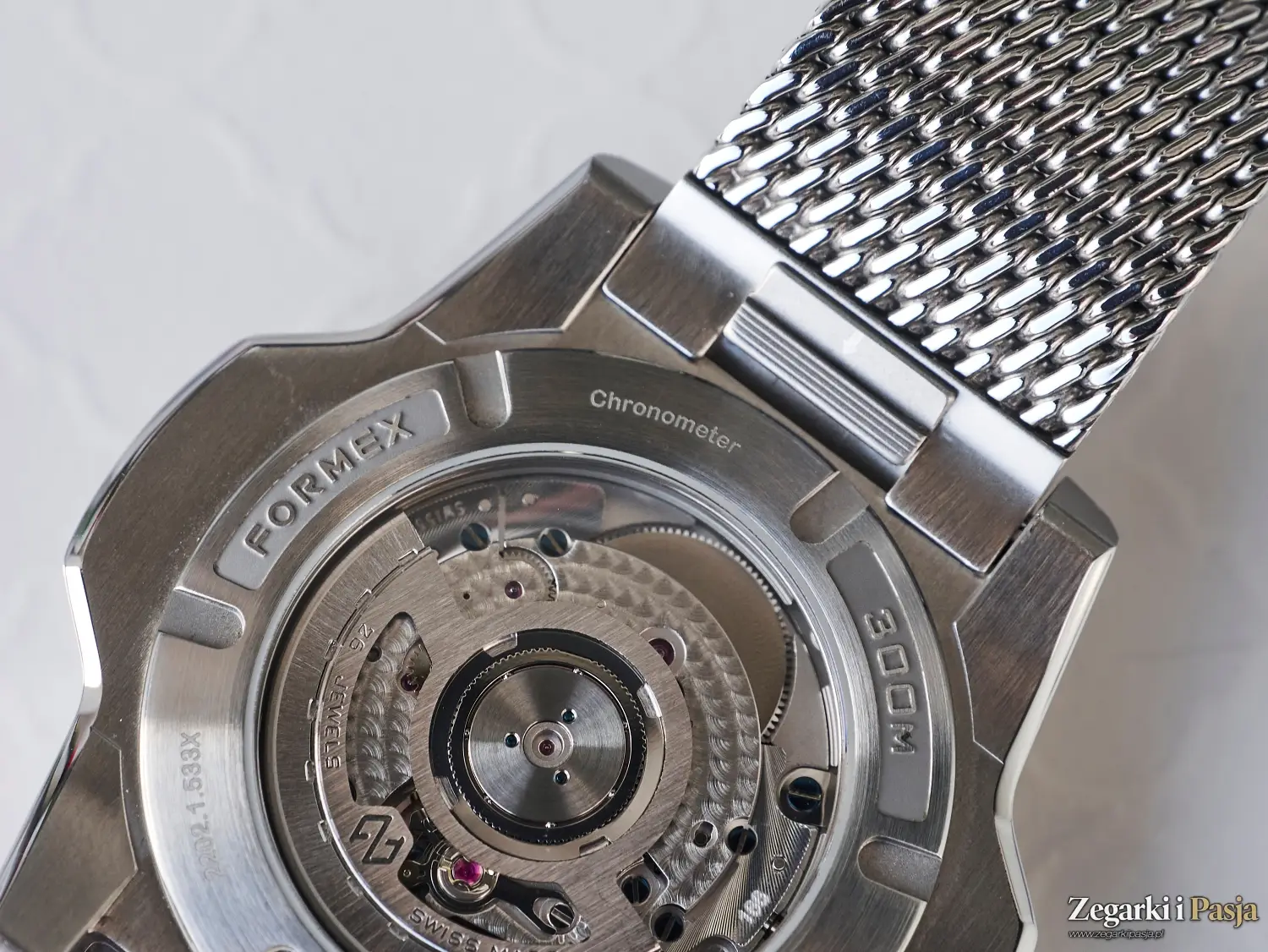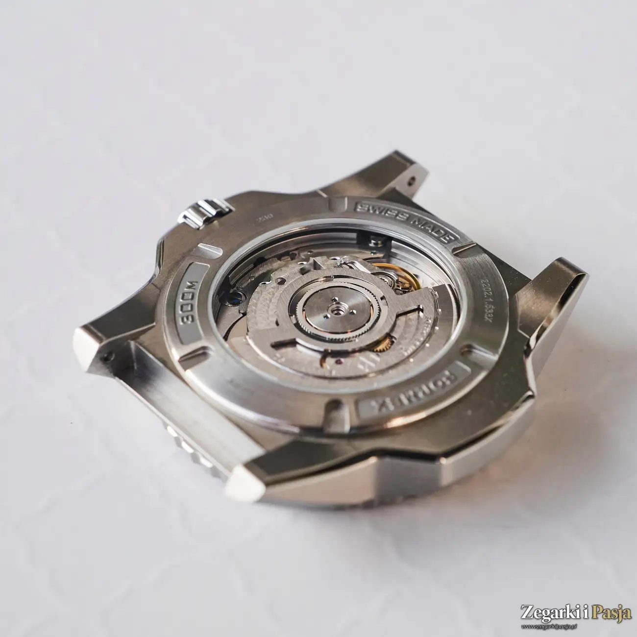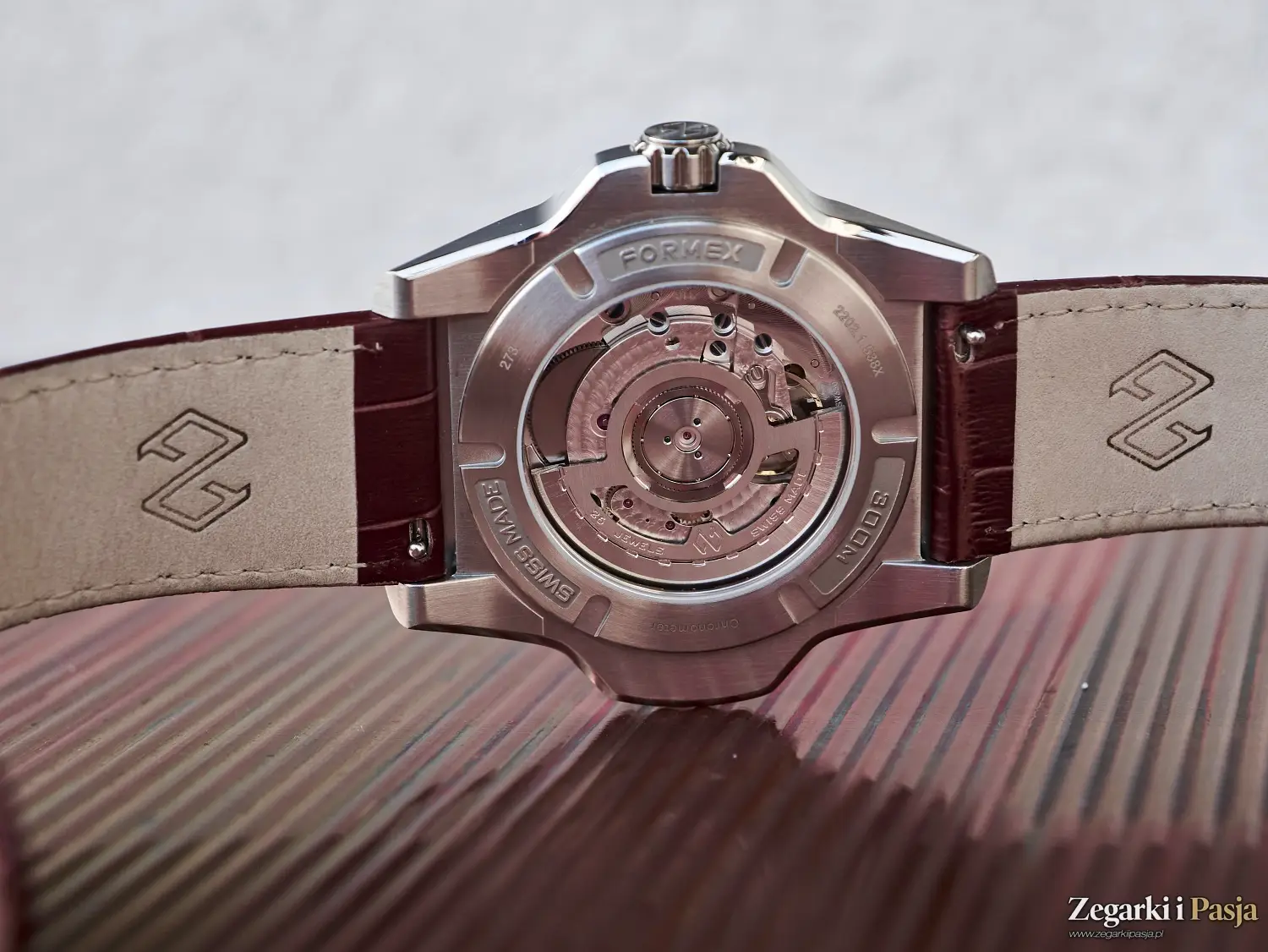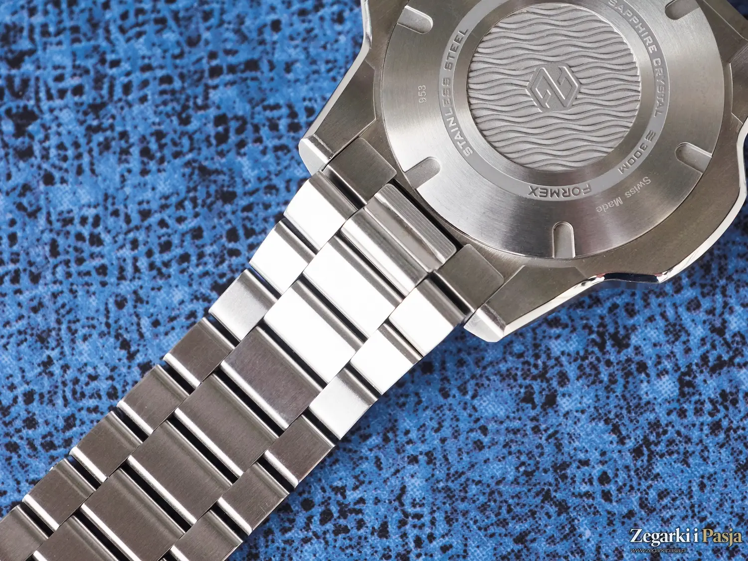 Marka Formex dodatkowo dekoruje mechanizm, stosując szkieletowany rotor własnej konstrukcji z termicznie barwionymi na niebiesko śrubami, co nadaje mu estetycznego charakteru. Musicie mi uwierzyć na słowo, ponieważ dekiel wersji nurkowych jest pełny, stalowy i wkręcany.