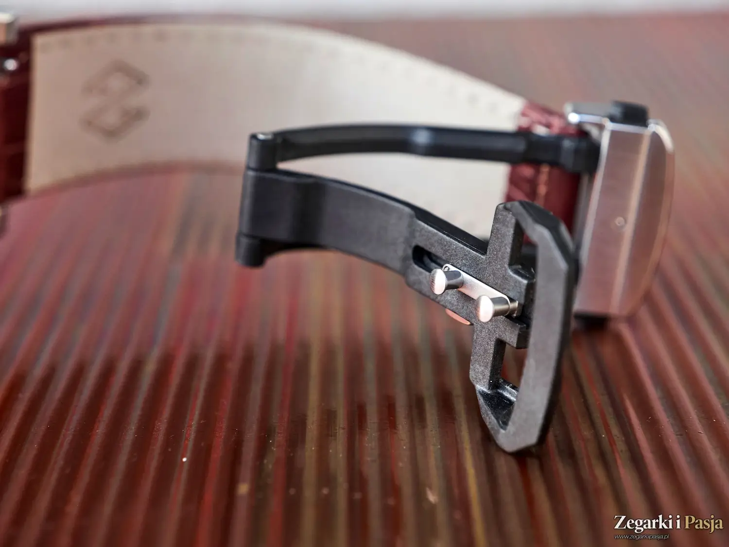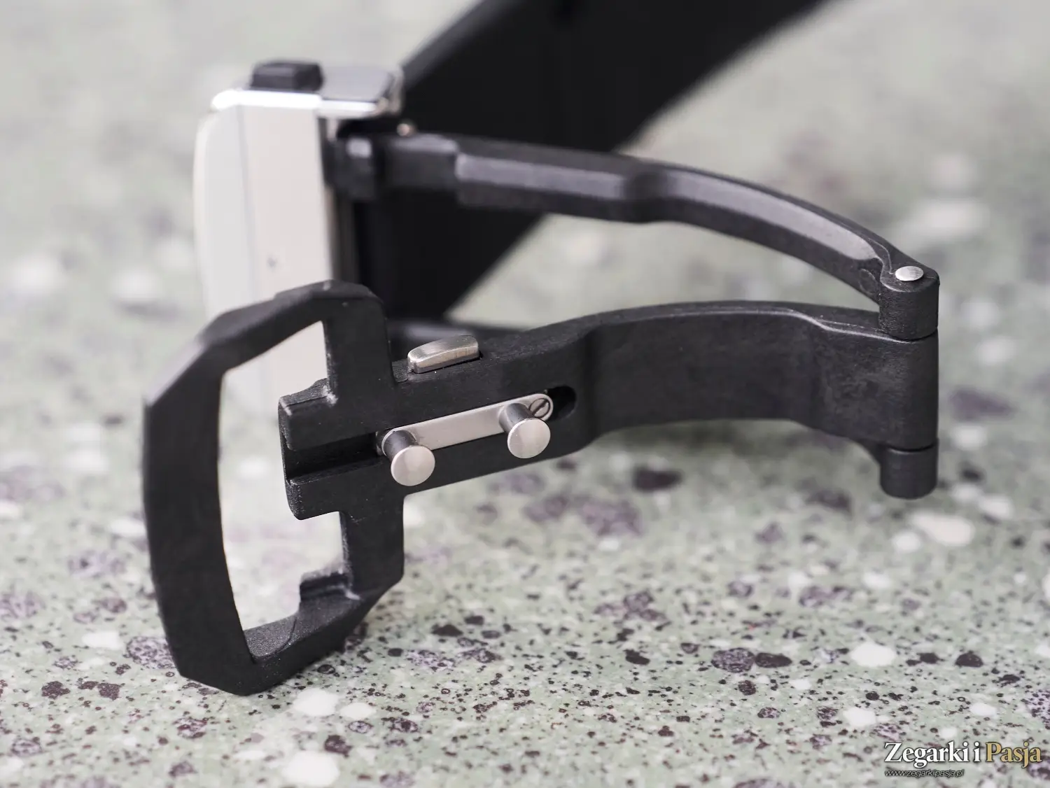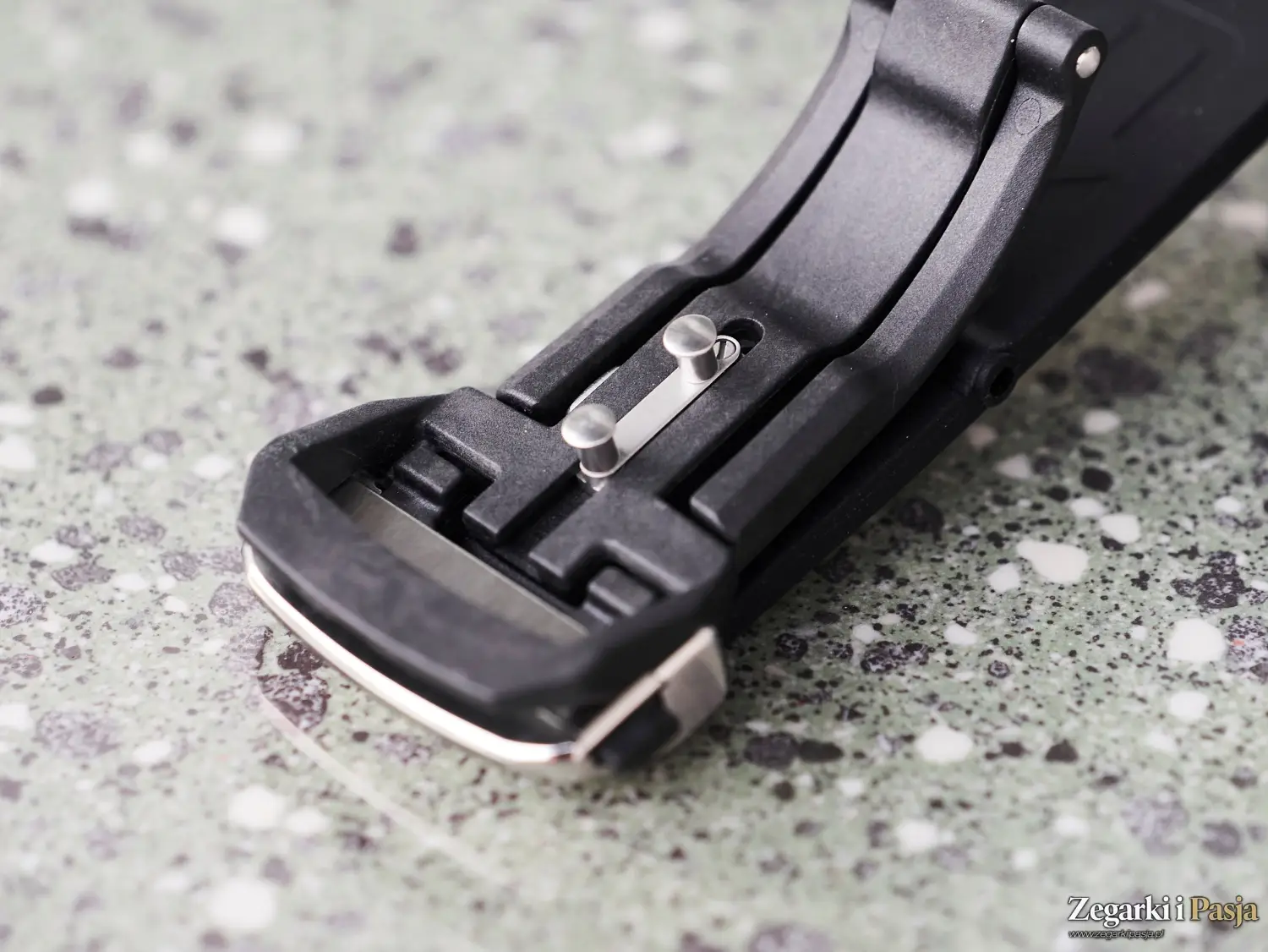Pasek gumowy z zakrzywionymi sprężynkami i karbonową klamrą oferuje regulację długości o 7 mm, co pozwala na precyzyjne dopasowanie go do nadgarstka w różnych okolicznościach i warunkach użytkowania, np. podczas zmian temperatury czy zwiększonej wilgotności, oraz w sytuacji, gdy dziurki nie zapewniają idealnego dopasowania do nadgarstka. System jest bardzo pomysłowy – naciśnięcie obu przycisków zwalnia zapięcie paska, a naciśnięcie lewego przycisku (patrząc od spodu nadgarstka) pozwala na regulację długości paska.
