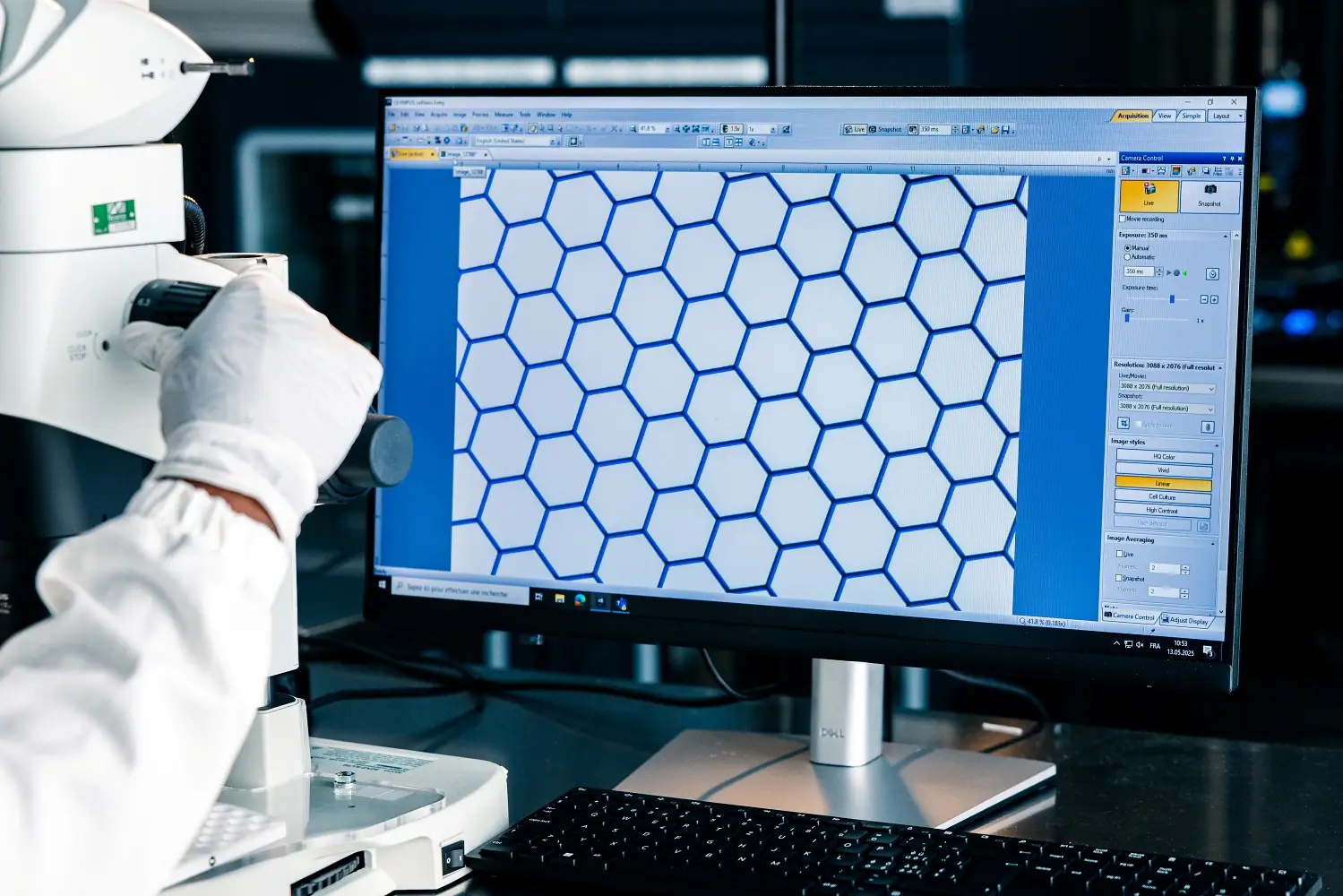 Strukturyzację plastra miodu: za pomocą fotolitografii tworzy się mikroskopijną siatkę w kształcie plastra miodu, która maksymalizuje powierzchnię absorpcji światła. Struktura ta jest precyzyjnie wycinana, aby zapewnić optymalną wydajność przy minimalnej widoczności.