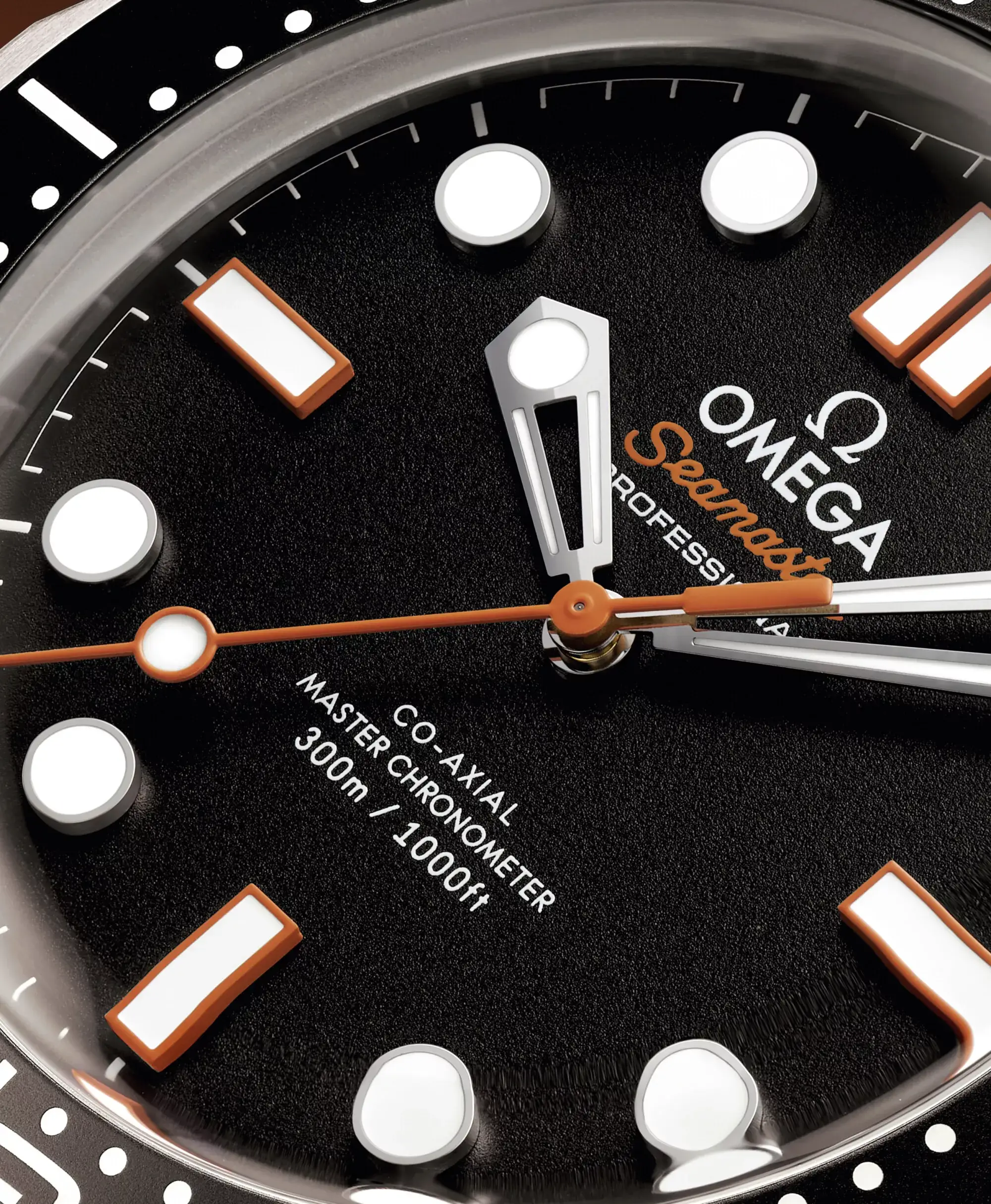 Prezentowana Omega Seamaster Diver 300M w wersji “Orange” wyróżnia się czarną, aluminiową tarczą, która ma wyraźnie ziarnistą strukturę, dzięki czemu jest w pełni matowa, co z kolei zapewnia doskonały, kontrastowy podkład indeksy i wskazówki.