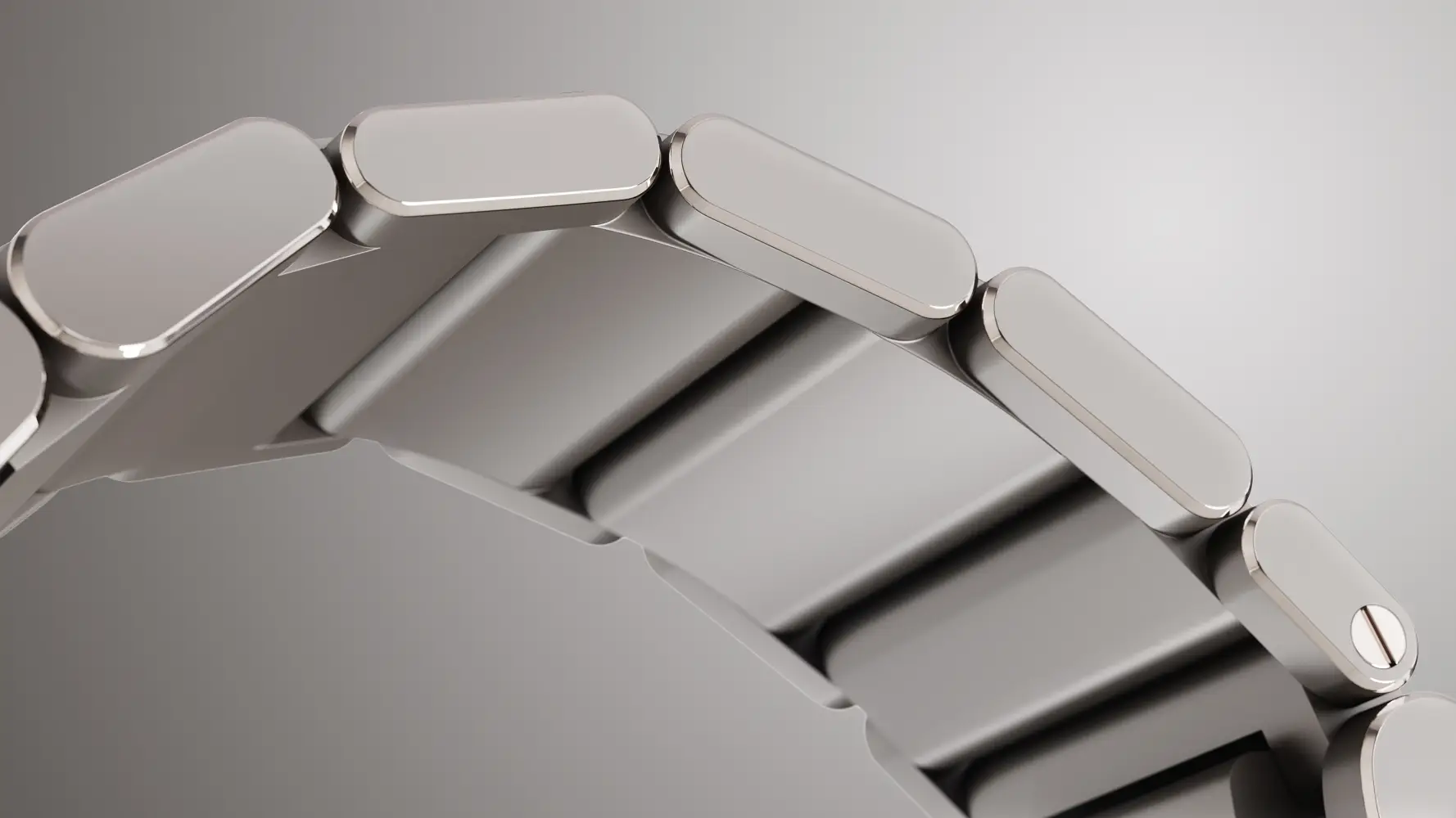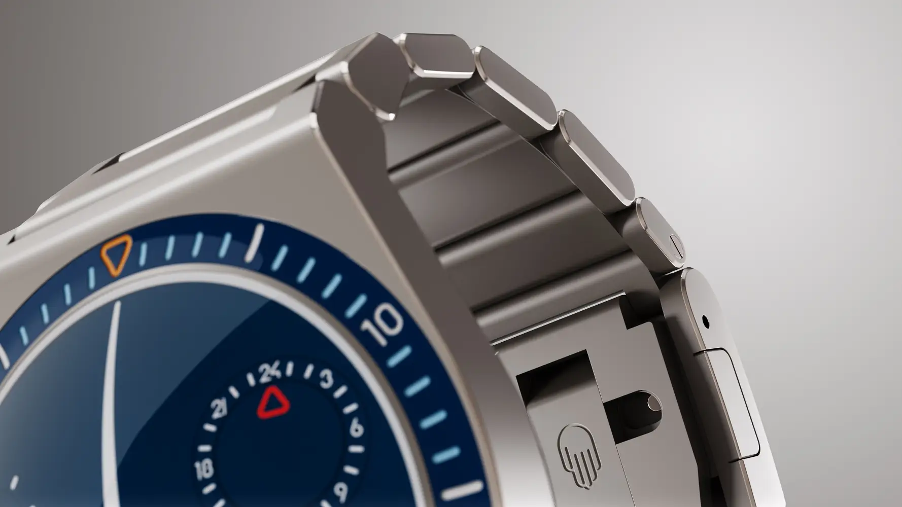 Koperta Ressence Type 7 wykonana jest z tytanu klasy 5, z mocno ściętymi, prostymi bokami. Jej średnica mierzy 41 mm przy grubości 14 mm, a jej kształt płynnie łączy się ze zintegrowaną bransoletą. Sama bransoleta otrzymała szerokie ogniwa oraz zapięcie oferujące mikro regulację w pięciu pozycjach, które obsługujemy specjalnym suwakiem.
