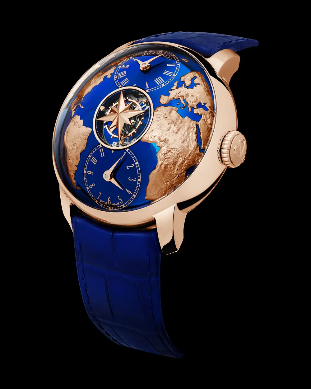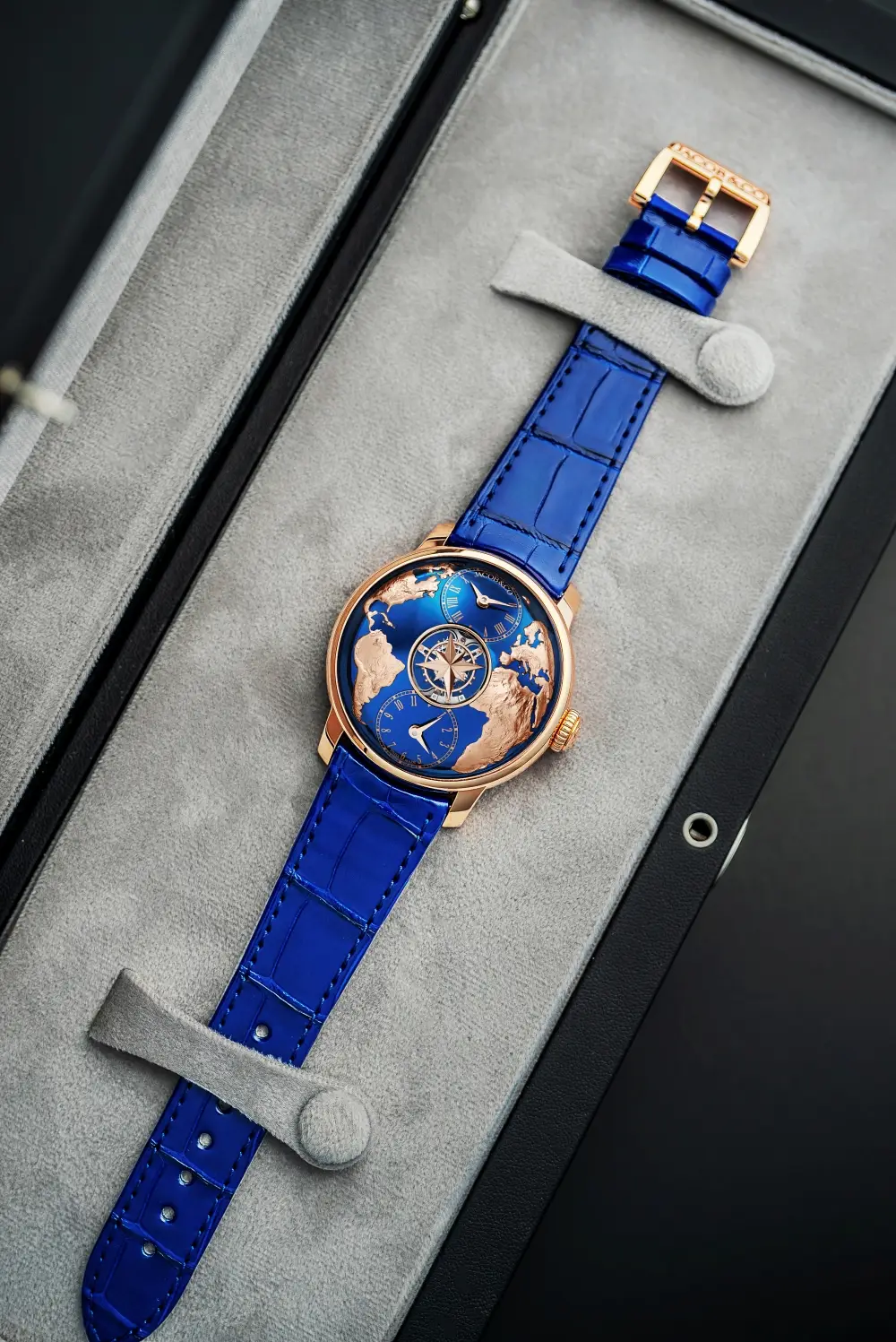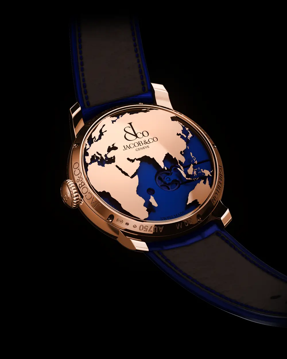 Kolejny laser, w następnym etapie wykańczania, usuwa niebieskie części znajdujące się na kontynentach, a te odsłonięte części zostały wykończone różowym złotem 5N. Co ciekawe, kontynenty niejako “pominięte” na głównej tarczy znalazły się na tylnej stronie obudowy wykonanej z niebieskiego szkła szafirowego. Na środku Oceanu Atlantyckiego widzimy dwie subtarcze, nachylone pod kątem 64 stopni.