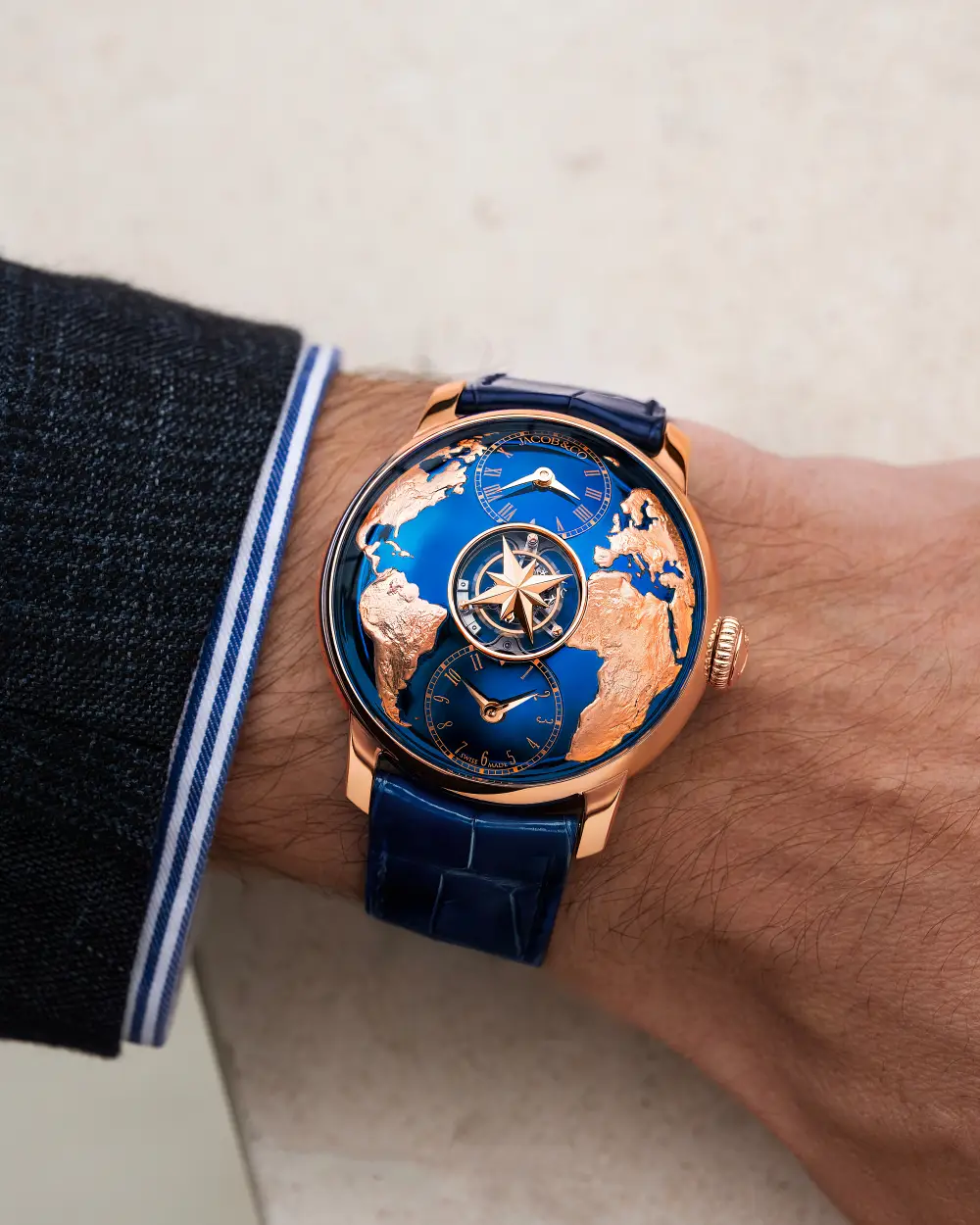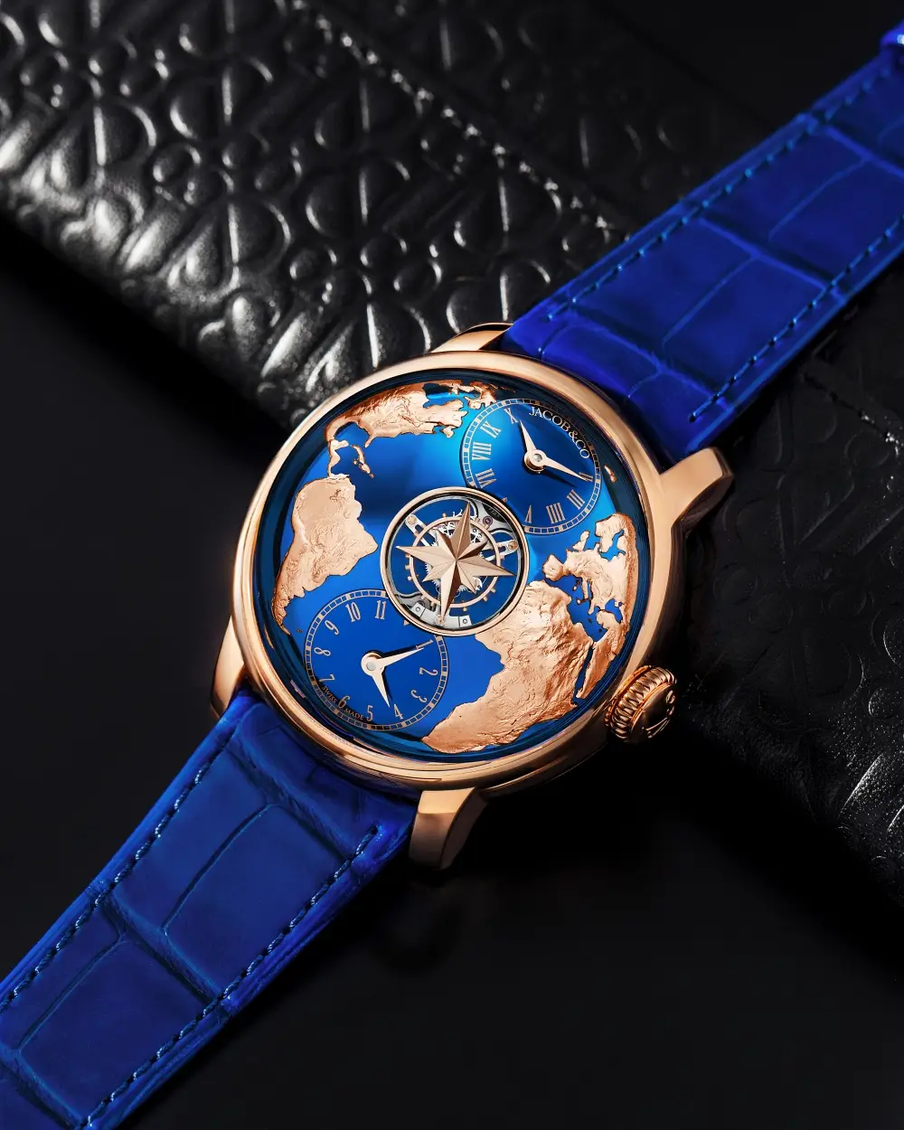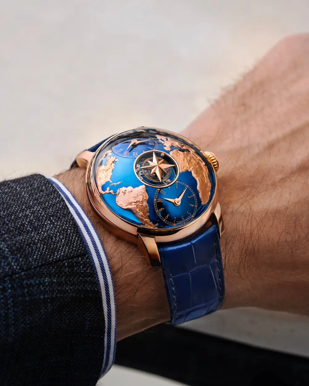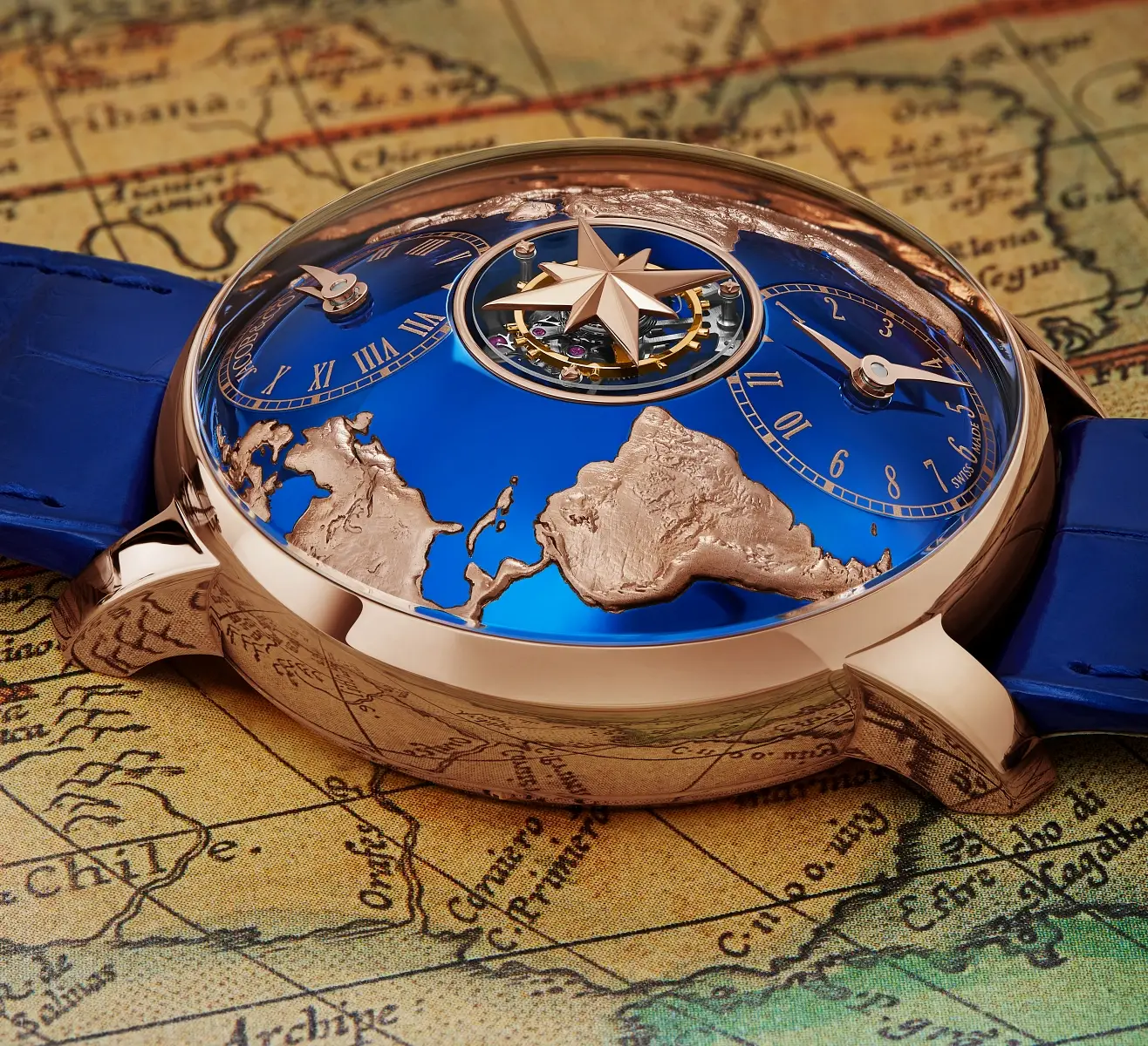 Kolejny laser, w następnym etapie wykańczania, usuwa niebieskie części znajdujące się na kontynentach, a te odsłonięte części zostały wykończone różowym złotem 5N. Co ciekawe, kontynenty niejako “pominięte” na głównej tarczy znalazły się na tylnej stronie obudowy wykonanej z niebieskiego szkła szafirowego. Na środku Oceanu Atlantyckiego widzimy dwie subtarcze, nachylone pod kątem 64 stopni.