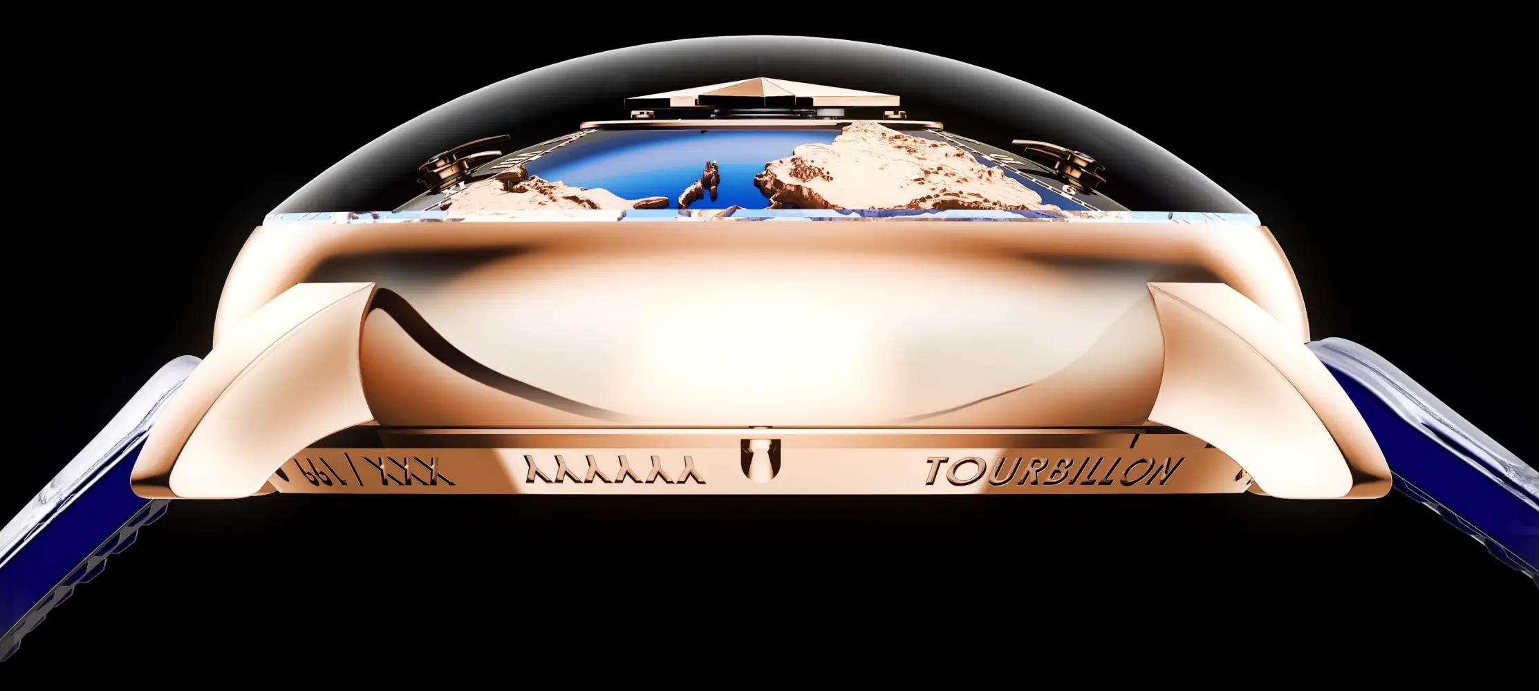 Mocno zakrzywiona tarcza zegarka pokazuje niezwykły poziom szczegółowości i wyrafinowanie, z którego przecież marka ta słynie. Jej mocno zakrzywiony kształt wyraźnie rzuca się w oczy, a element ten został wykonany z tytanu, który poddano obróbce przy użyciu precyzyjnego lasera, aby idealnie odwzorować każdy szczegół widoczny zarówno na lądzie jak i na krawędzi styku z oceanami. Następnie element ten został pokryty powłoką PVD na niebiesko.