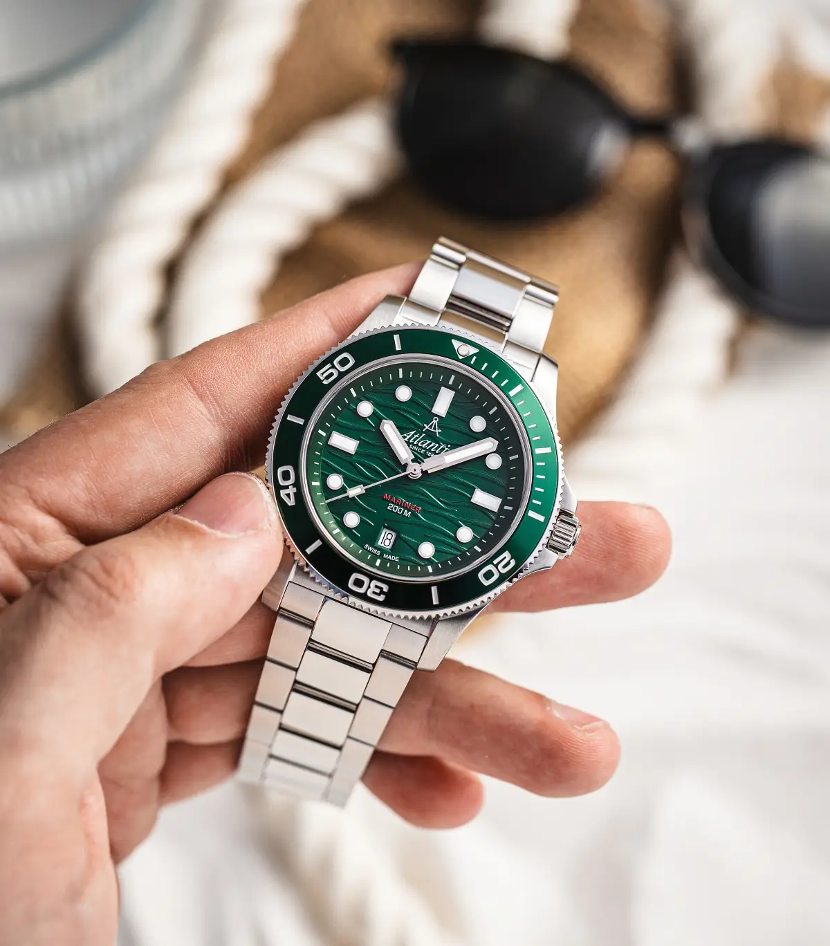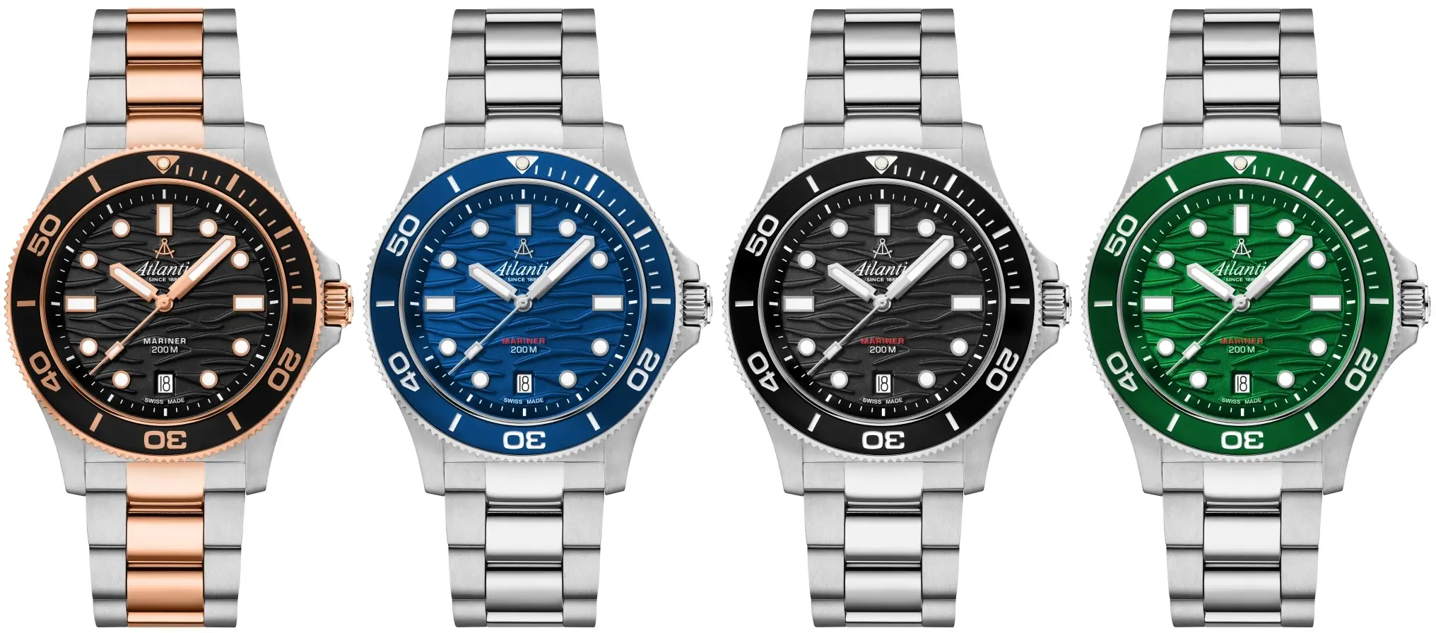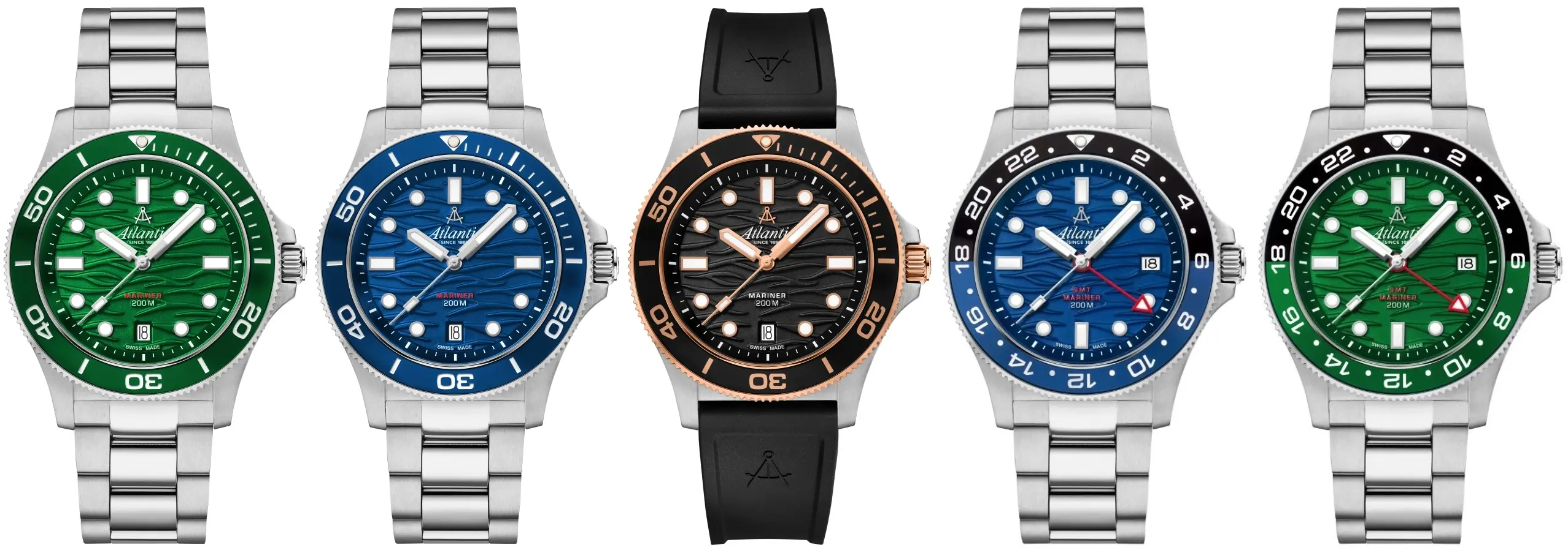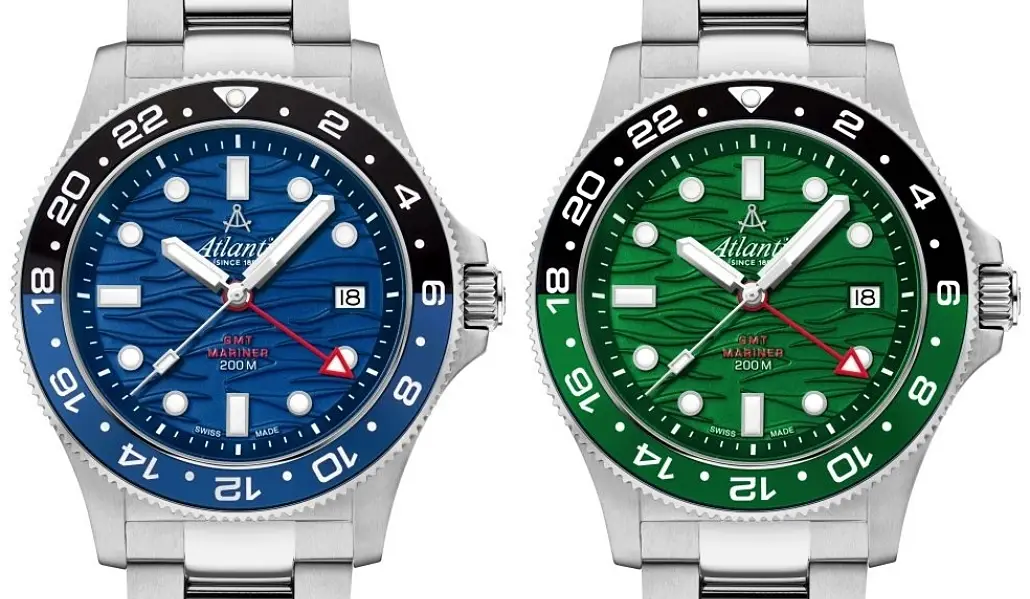 Biorąc pod uwagę wersje kolorystyczne, to wspomniane trzy zegarki Atlantic Mariner Quartz Wave - czarny i niebieski na bransolecie oraz czarny na silikonowym pasku - są opcjami prostymi, wskazującymi czas i datę. W tych zegarkach wkładka lunety ma kolor dobrany do barwy tarczy. Jeśli chodzi o zegarki z dodatkową funkcją GMT, mamy do czynienia z tarczami w wersjach niebieskiej i zielonej.