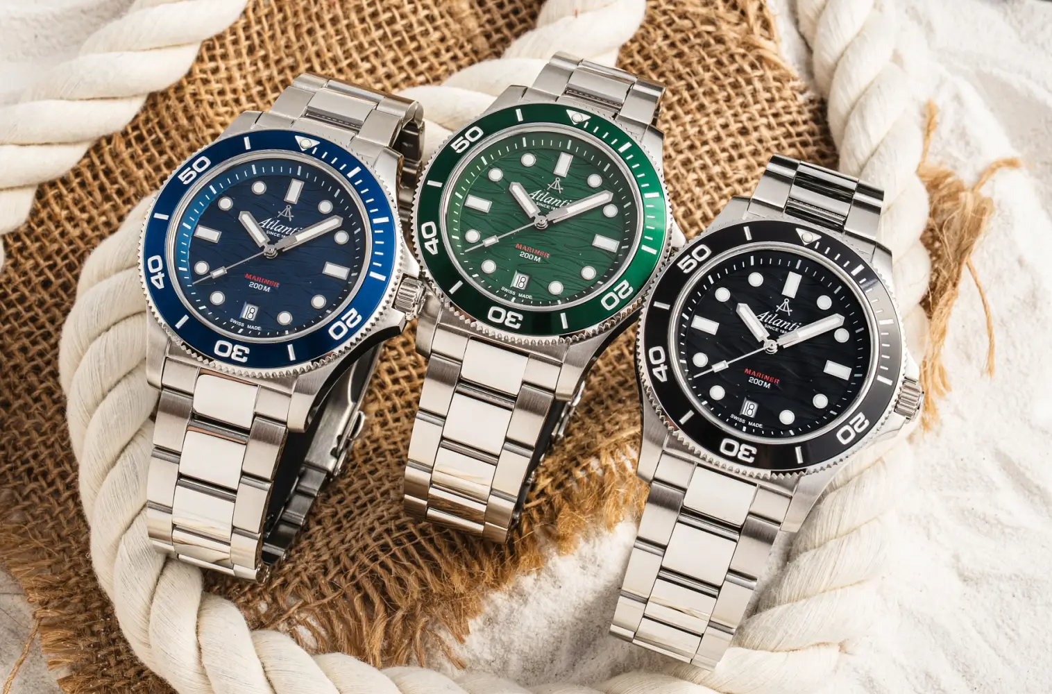 Trójwskazówkowe wersje Atlantic Mariner Quartz Wave - czarna i niebieska - oferowane są na klasycznej trójrzędowej bransolecie, przy czym ogniwa zewnętrzne są szczotkowane, a rząd ogniw środkowych jest polerowany na wysoki połysk, co bardzo dobrze komponuje się z całym zegarkiem. Zapięcie bransolety to klasyczna, składana klamra zwalniana przyciskami, z dodatkową, zabezpieczającą zapadką, która jest polerowane na wysoki połysk, kontrastując ze szczotkowaną powierzchnią klamry, na której wygrawerowano nazwę i logo firmy.