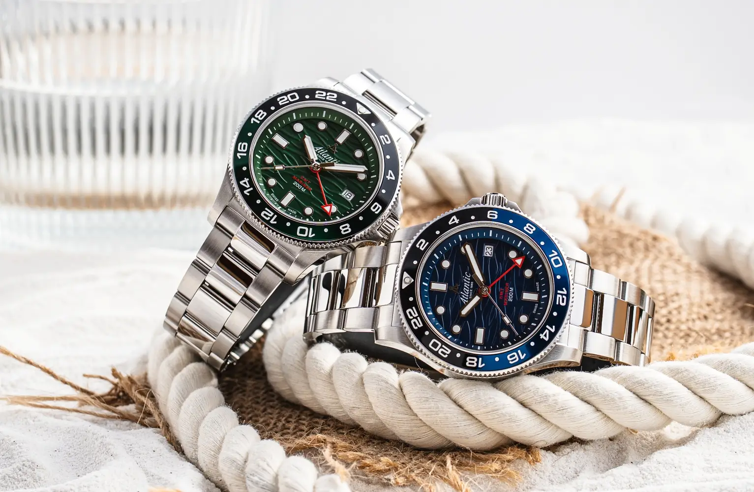 Oba zegarki z funkcją GMT - z tarczą zieloną i niebieską - oferowane są na stalowej bransolecie.