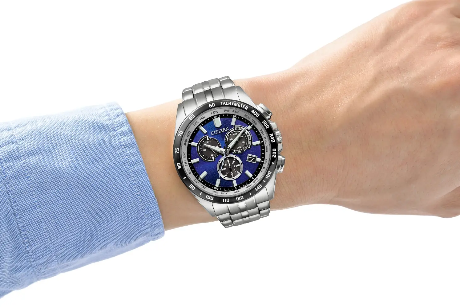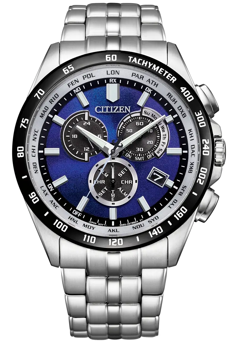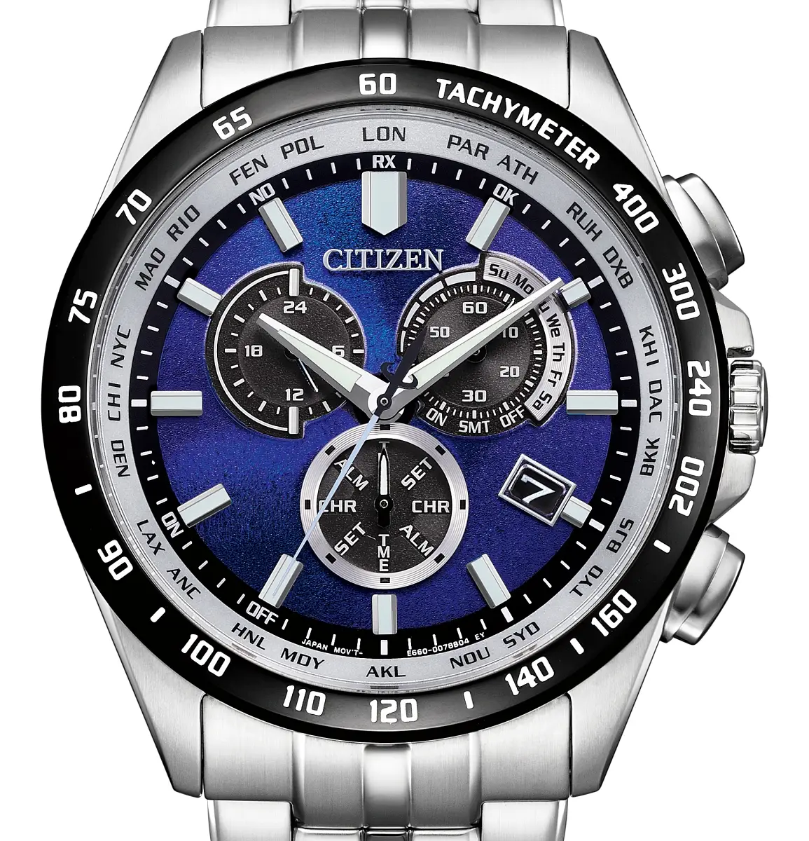Na tarczy modelu Citizen Eco-Drive Radio-Controlled (ref. CB5874-81L) znajdziemy nakładane indeksy wypełnione substancją luminescencyjną, tak samo jak i wskazówki. Na skośnym pierścieniu widocznym pod szkłem szafirowym z powłokami przeciwodblaskowymi naniesione są trzyliterowe kody stref czasowych, a na zewnętrznym pierścieniu lunety skala tachometru.