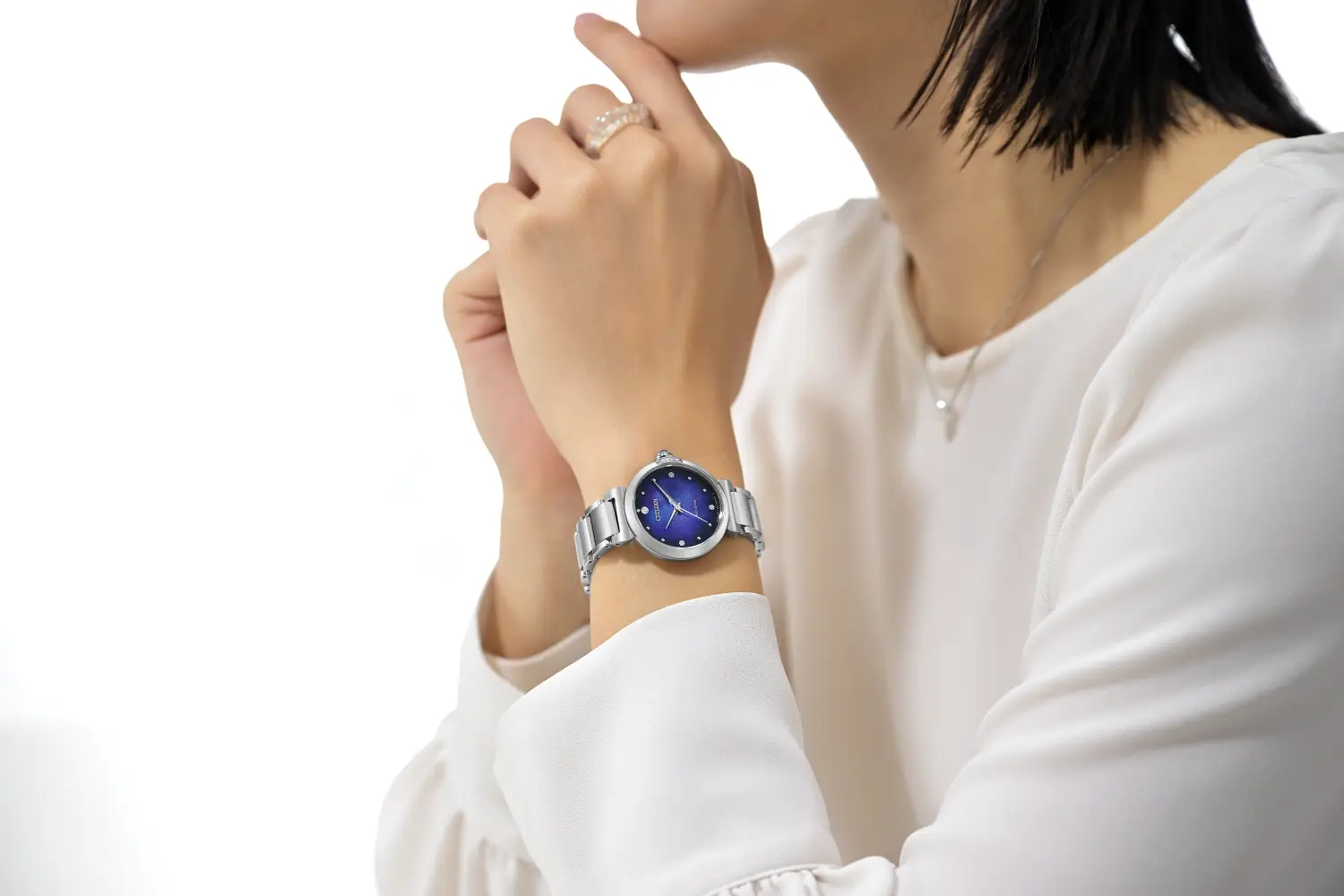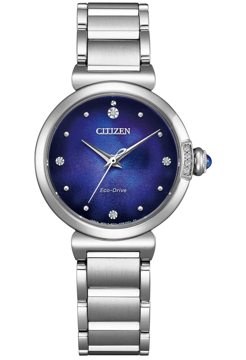 Koronka ozdobiona jest kaboszonem z syntetycznego szafiru, a na pierścieniu lunety obok niej znajdziemy też 4 diamenty. Srebrne wskazówki obracają się nad delikatnie zafalowaną powierzchnią morskiej wody w rytmie wyznaczanym przez mechanizm Eco-Drive E031, zasilany światłem, o dokładności ±15 sekund na miesiąc i rezerwą chodu do 6 miesięcy. Wodoszczelność tego modelu to również 5 ATM (50 m).