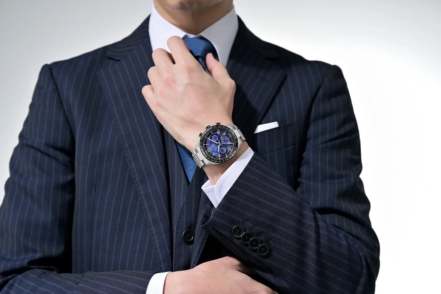 Wykonana z nierdzewnej stali koperta z czarną powłoką jet black, o średnicy 43,0 mm i grubości 12,0 mm, ma zdecydowanie nowoczesny i sportowy wygląd. Z kopertą zestawiono bransoletę ze stali o zaoblonych ogniwach. Tarcza ze strukturalnym malowaniem w głębokim niebieskim kolorze pokryta jest barwnikiem, który zmienia odcienie w zależności od kąta padania światła.
