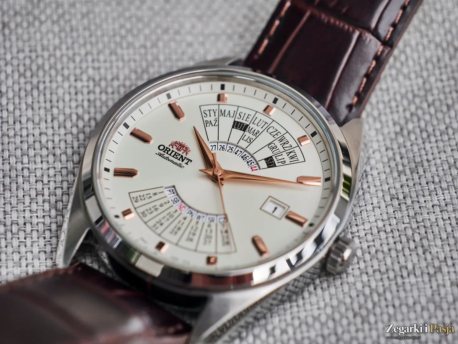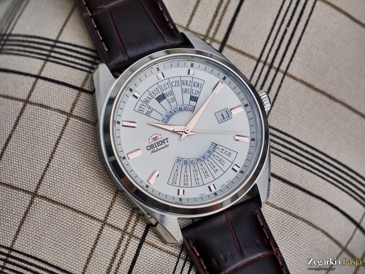 Jeśli chodzi o parametry Orient Multi-Year Calendar Poland, niczym nie różni się on od swoich anglojęzycznych wersji: koperta ma 43,5 mm, średnicy – sporo, ale na ręku nie wygląda na taki duży, głównie za sprawą umiarkowanej grubości koperty na poziomie 12 mm.