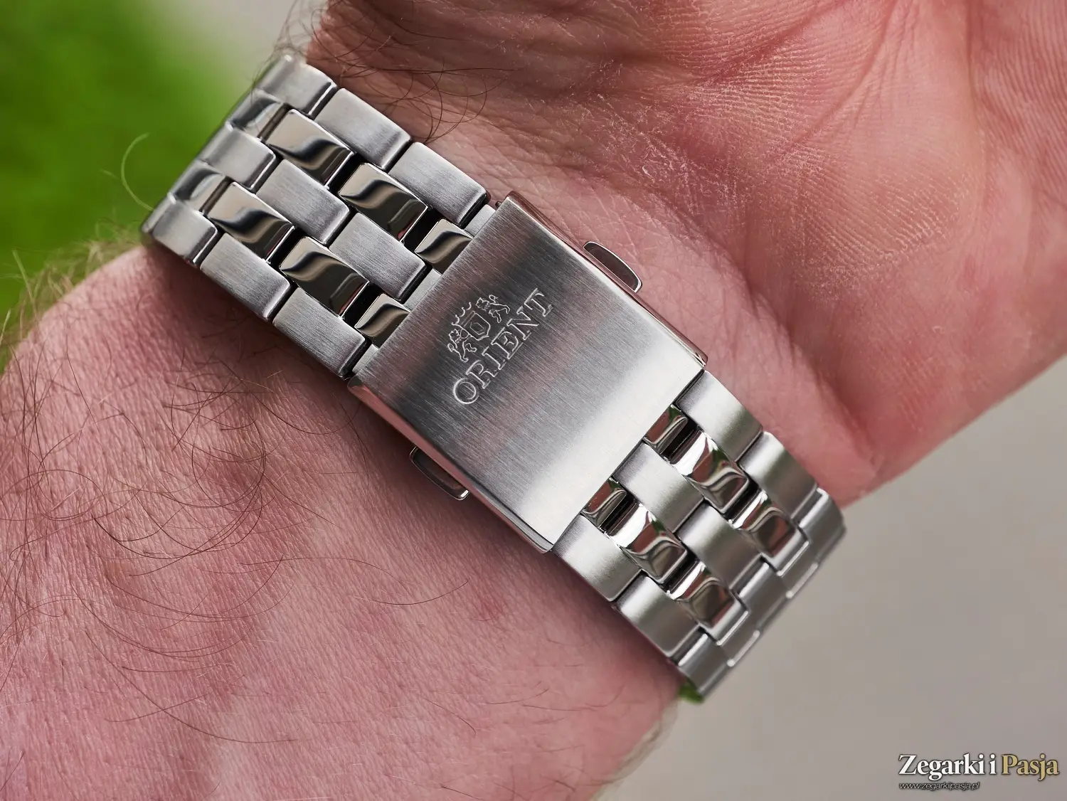 Ogniwa bransolety są naprzemiennie polerowane i szczotkowane, co sprawia, że wygląda jakby składała się z pięciu rzędów, choć w rzeczywistości są to pojedyncze elementy. Zapięcie jest składane i jest to w mojej ocenie najsłabszy punkt tego zegarka, ponieważ zapięcie jest niezbyt wysokiej jakości, wykonane z cienkiej blachy. Natomiast jest to standard w japońskich zegarkach o przystępnych czy umiarkowanych cenach. Klamra jest szczotkowana i dekorowana logo Orient.