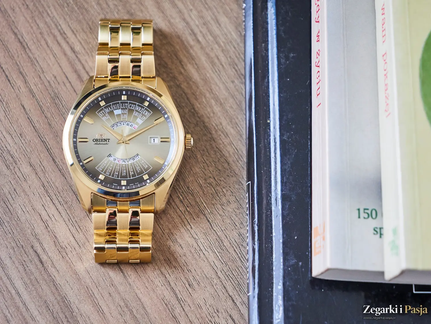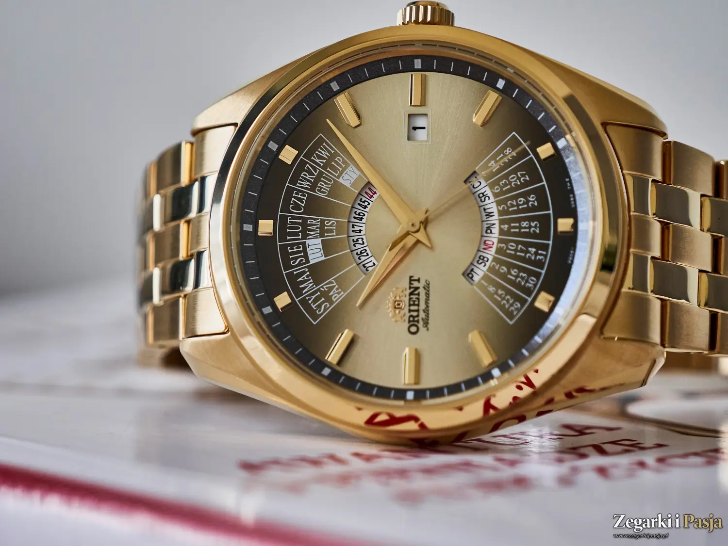 Ostatni wariant kolorystyczny zegarka Orient Multi-Year Calendar Poland, jaki do nas dotarł, to wersja w stalowej kopercie pokrytej złotą warstwą PVD, z taką samą bransoletą.