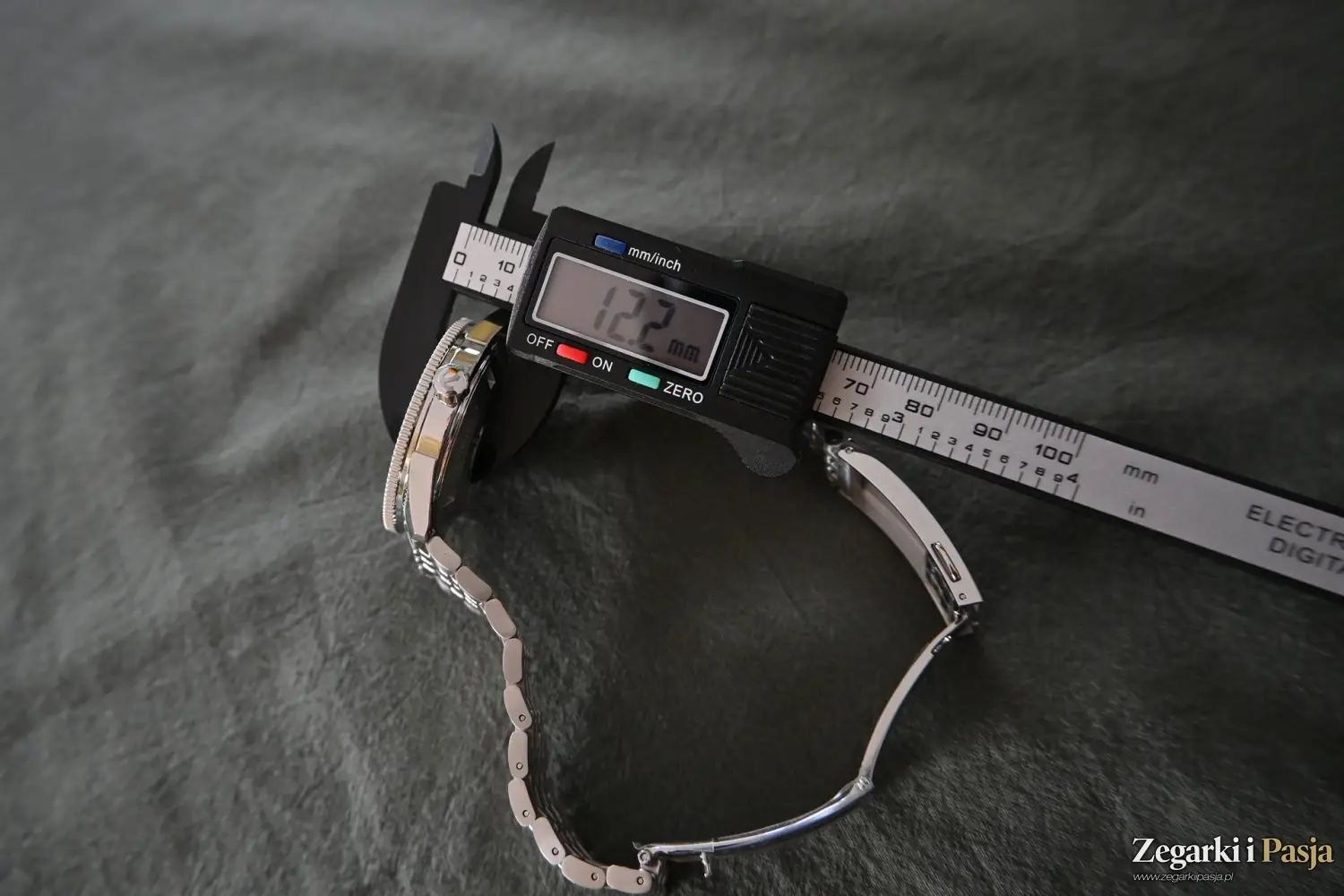 Mocny wpływ na wizerunek tego zegarka ma także zastosowana bransoleta. To konstrukcja wieloelementowa. Mamy tutaj aż siedem rzędów ogniw. Ogniwa boczne są klasyczne, jeśli chodzi o kształt i mają szczotkowaną powierzchnię, natomiast pięć rzędów ogniw pośrodku to ogniwa polerowane o kształcie ziarenek ryżu.