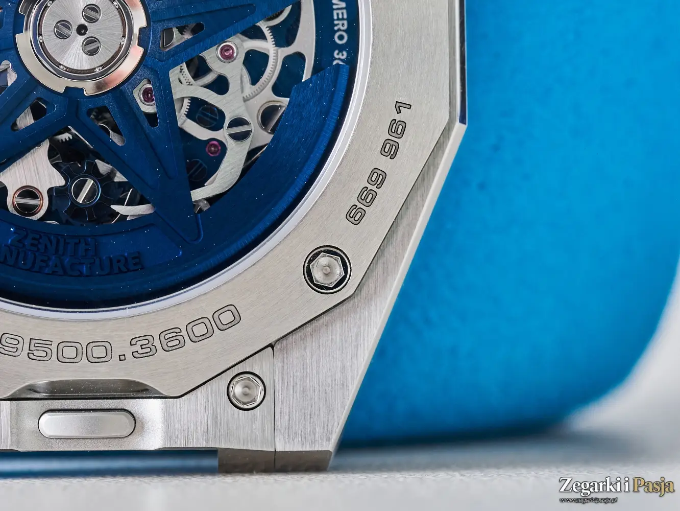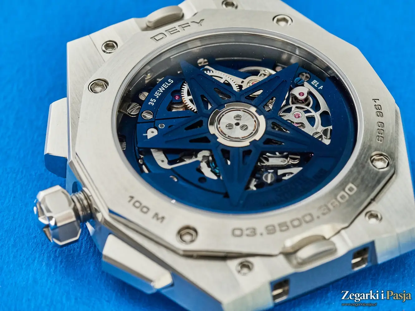 Również wkrętami – czterema - mocowany jest do koperty przeszklony dekiel, za którym widać barwiony na niebiesko szkieletowany rotor w kształcie gwiazdy Zenitha oraz elementy mechanizmu El Primero 3600. Na obwodzie dekla wygrawerowane są napisy DEFY, 100M, numer referencyjny: 03.9500.3600 oraz numer seryjny zegarka.