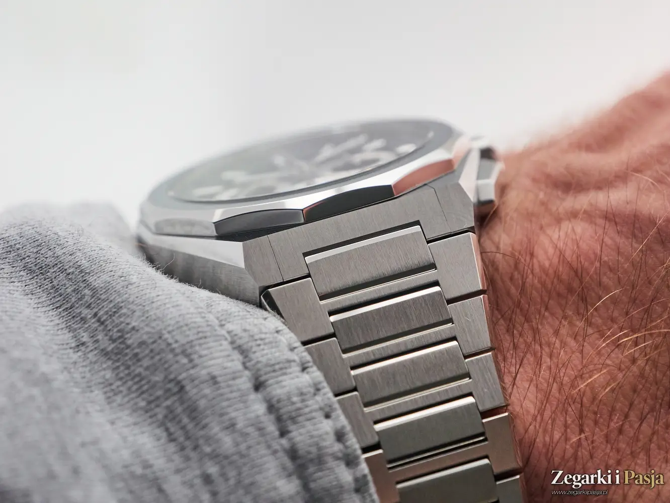 Powyżej i poniżej koronki znajdują się dwa skośne przyciski do sterowania funkcjami stopera, również szczotkowane i polerowane. Zintegrowana bransoleta jest idealnym przedłużeniem linii ściętych boków ośmiokątnej koperty, a jej powierzchnie górne i boczne są szczotkowane, natomiast ustawione skośnie płaszczyzny ogniw są polerowane.