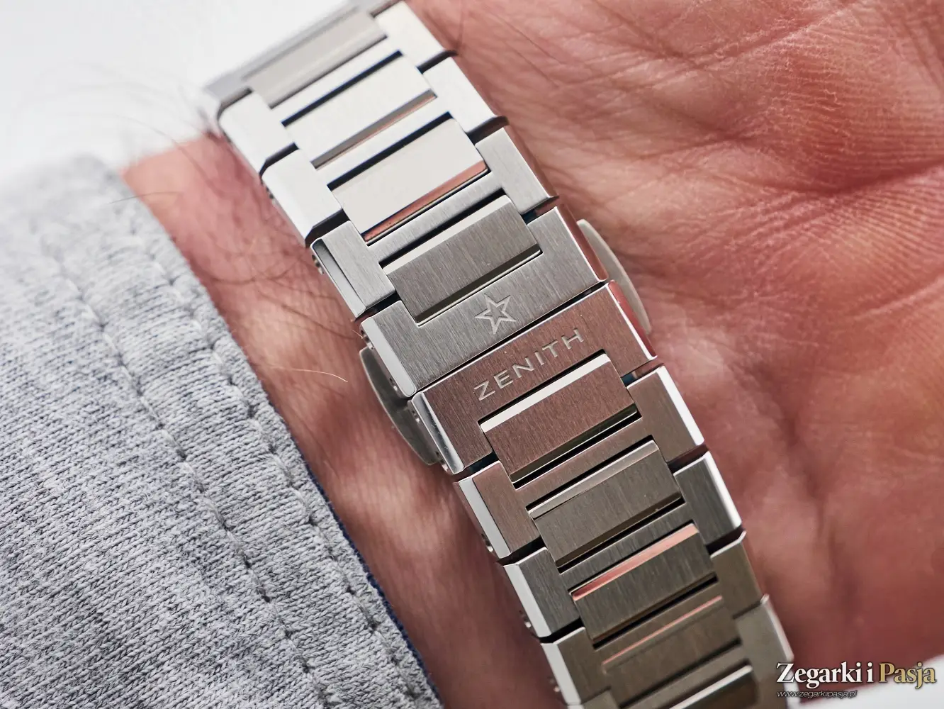 Bransoleta wyposażona jest w jeden z najlepiej działających systemów szybkiej zmiany z jakim miałem okazję się zetknąć. Wymiana bransolety jest łatwa i szybka, a mocowanie solidne i ekstremalnie pewne. Cokolwiek bym nie robił i jak bardzo byłbym niezgrabny – nie ma szansy, żeby tego nie zrobić poprawnie. Nie da się też przy tym zarysować koperty czy bransolety. Najwyższa klasa. Ogniwa bransolety służące do zmiany rozmiaru mocowane są na śruby, do ich wykręcenia potrzebne są dwa płaskie wkrętaki. Zapięcie motylkowe jest ukryte, jedynym oznaczeniem miejsca styku końców bransolety jest logo i napis Zenith.