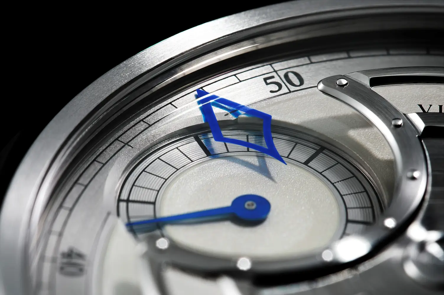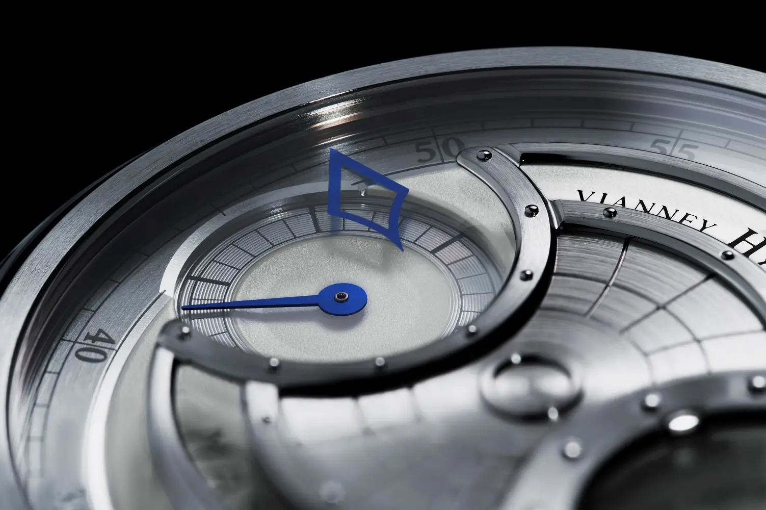 Subtarcza na godzinie 3. pokazuje aktualną godzinę, na 9. znajduje się sekundnik, zaś śledzenie minut ma miejsce na pierścieniu zlokalizowanym na zewnętrznej części tarczy. Sama wskazówka, a dokładniej niebieski romb wydaje się unosić nad cyferblatem. W rzeczywistości wskazówka-romb jest przymocowana do obrotowego dysku, dzięki czemu udało się osiągnąć taki efekt wizualny. Cyfry arabskie, które pełnią funkcję znaczników godzinowych, umieszczono na pierścieniu, co dobrze komponuje się z pozostałymi detalami na całej tarczy. Dodatkowo na jej powierzchni możemy dostrzec dwie nazwy: Vianney Halter i Massena, które odnoszą się do twórców tego zegarka, a na uwagę zasługuje fakt, że napisy te zostały nadrukowane na szkle szafirowym, po jego wewnętrznej części.