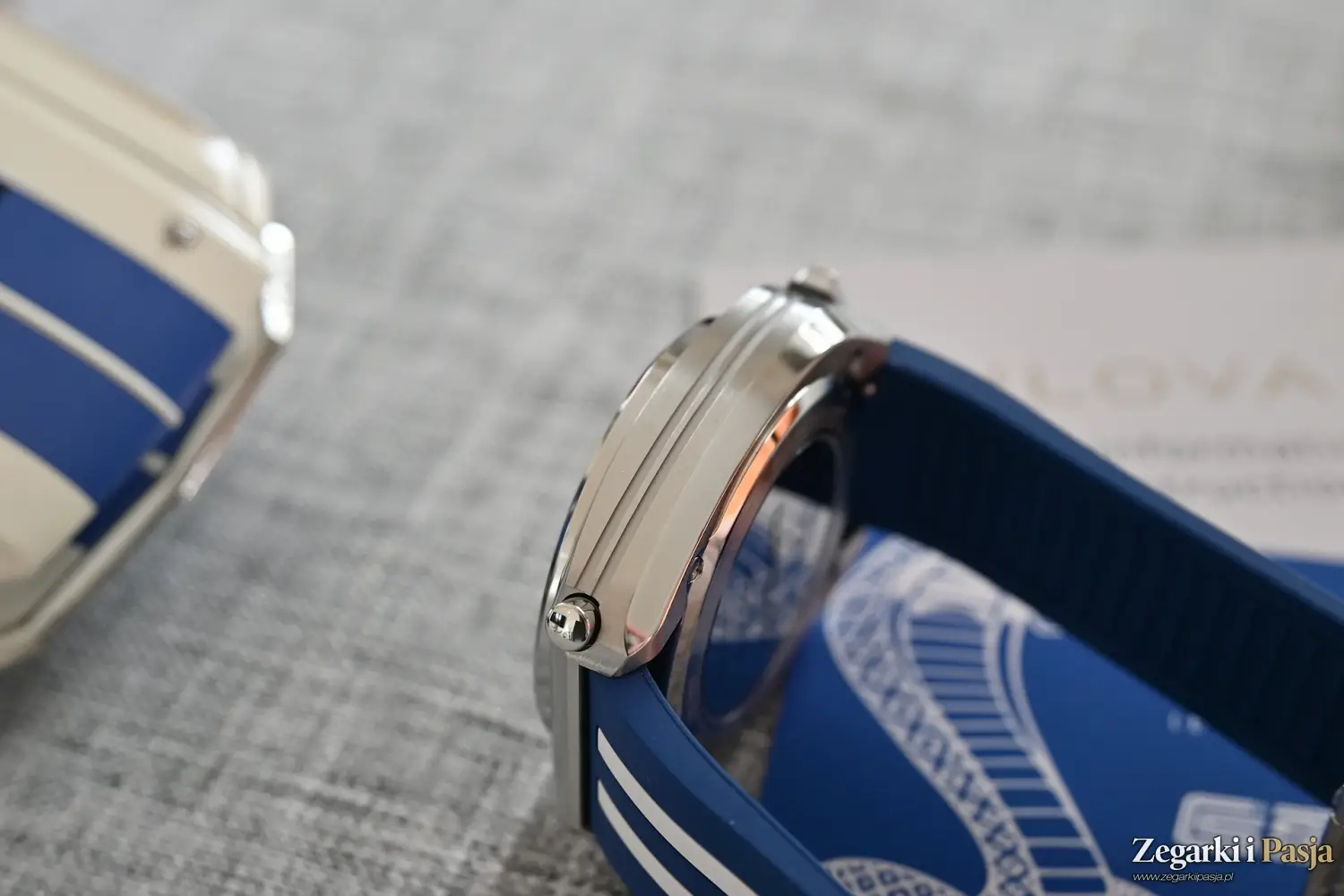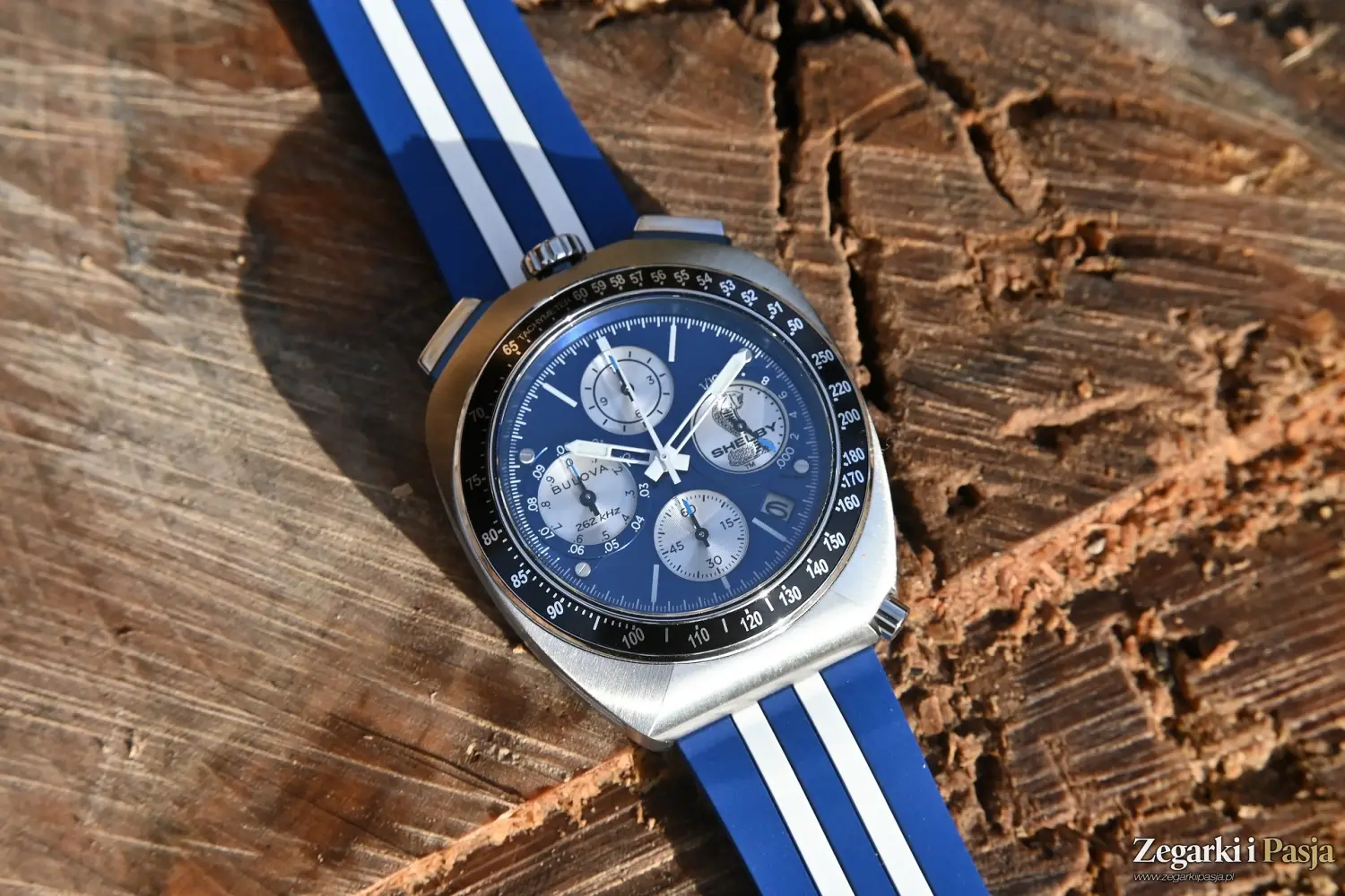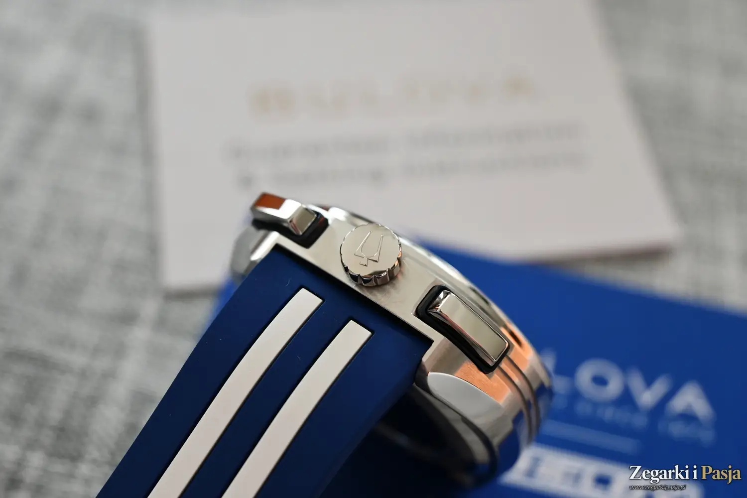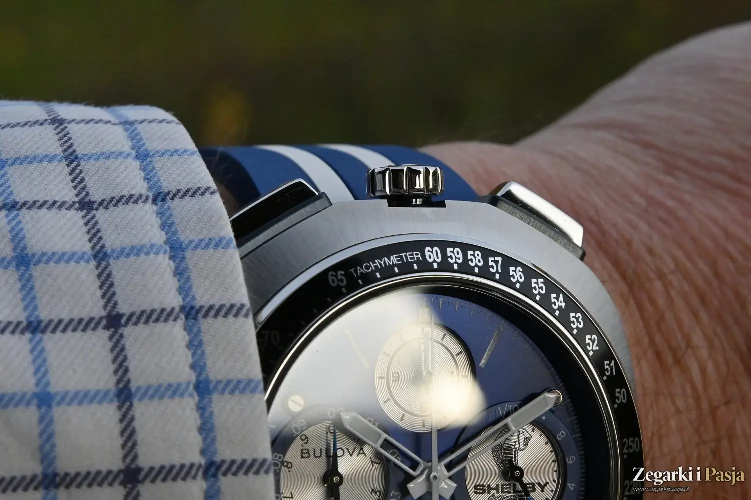 Koronka jest duża, a jej czołową część zdobi logo marki Bulova, czyli kamerton. Przyciski są polerowane, duże i wygodne w użytkowaniu. Przy osadzeniu ich w kopercie otaczają je ciemne ramki. Do tego kolorystyka utrzymana w niebieskich i białych barwach doskonale odnosi się do samochodu Shelby Mustang, który świetnie prezentował się w takim właśnie wydaniu.