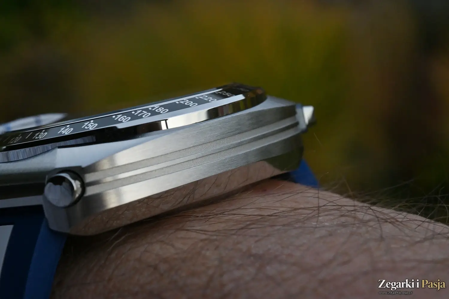Świetnie to wygląda. W tej szczotkowanej powierzchni jest jakby lekko zatopiona polerowana krawędź dość szerokiej lunety. Ma ona wkładkę w kolorze czarnym, na której naniesiono skalę tachometru, co mocno podkreśla sportowe przeznaczenie tego zegarka.