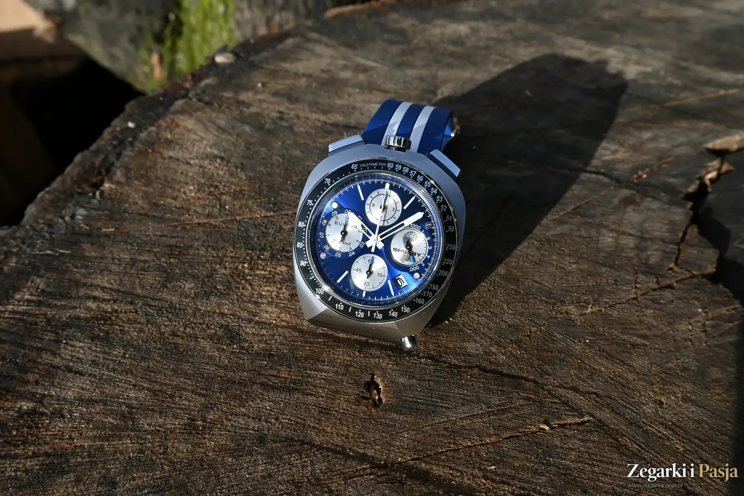 Koperta ma 43 milimetrów średnicy i 14 milimetrów grubości. Jest duża, ale brak klasycznych uch i mocowanie paska od spodu powodują, że nie będzie ten zegarek źle wyglądał nawet na szczupłym nadgarstku. Poza takimi elementami zdobiącymi, jak wspomniane wyżej ramki przycisków czy granatowy pierścień pod koronką, są jeszcze równolegle poprowadzone linie na bocznych powierzchniach, lekko zagłębione, odnoszące się do charakterystycznych, malowanych pasów na karoserii Shelby GT.