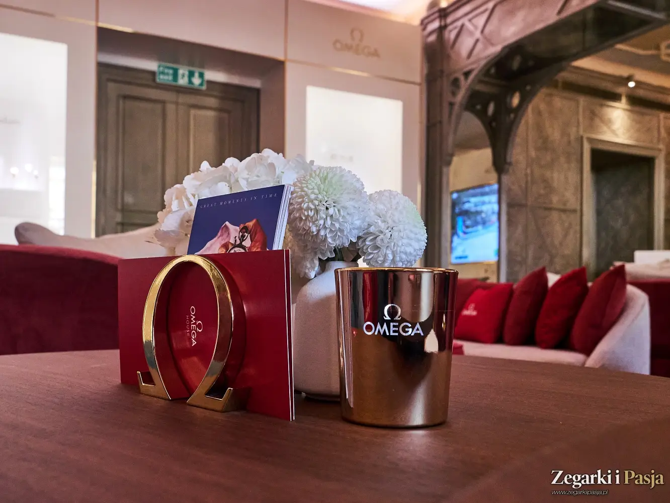 Detale dopracowane do perfekcji – od złotych emblematów Ω i świec na stolikach, przez świeże, białe i czerwone kwiaty, poduszki z logo Omega, zdjęcia ambasadorów na ścianach, aż po zapach świeżo mielonej kawy, która smakuje tu jak nigdzie indziej.