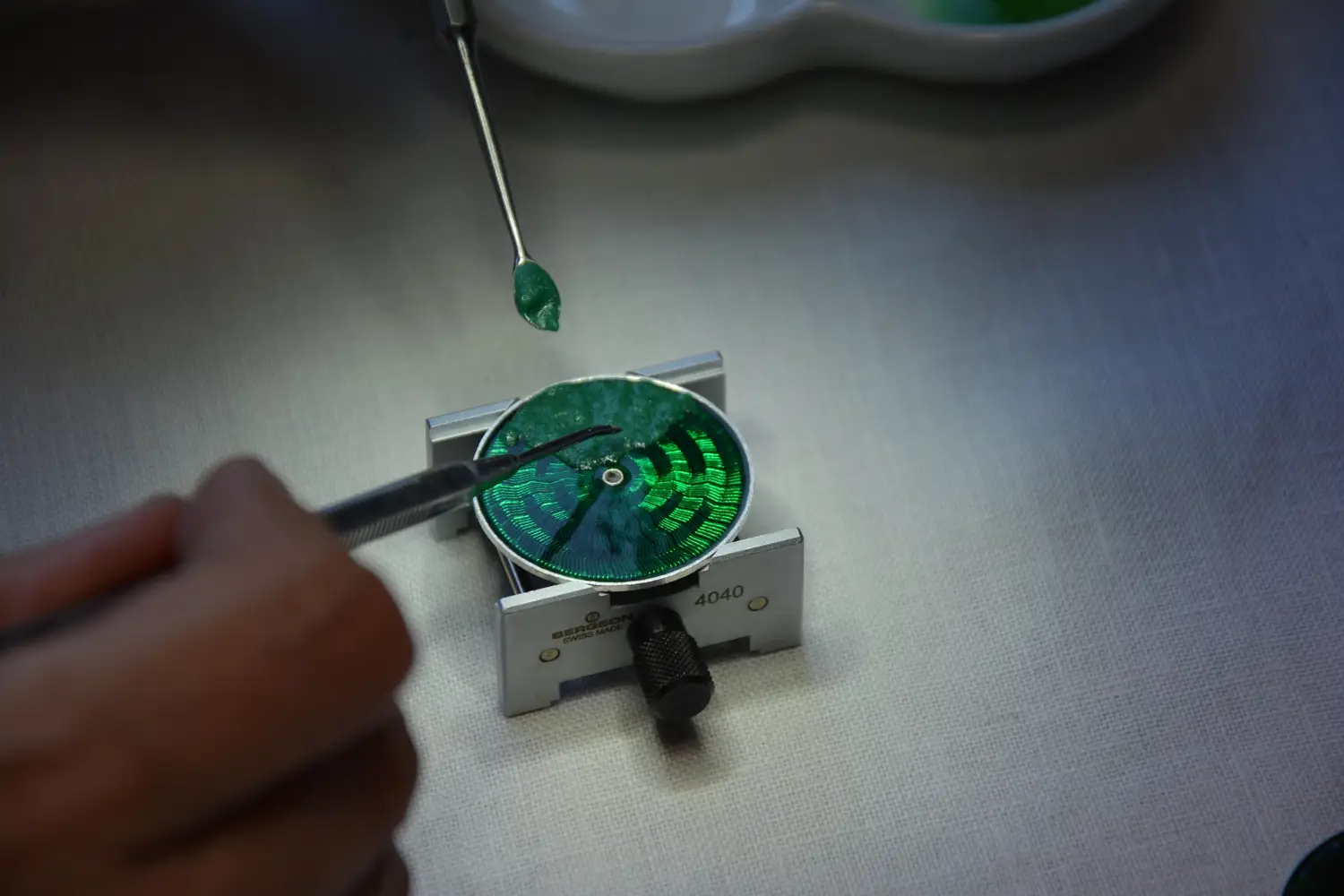 Cyferblaty tworzone są z zastosowaniem czternastu różnych barw emalii transparentnych, połączonych w unikalne i starannie dobrane kompozycje kolorystyczne. W zależności od koloru tarczy stosowane są dwa lub trzy rodzaje emalii, aby osiągnąć właściwe nasycenie i wizualny efekt głębi. Są dziełem wybitnej artystki emalierki Ewy Buksy.